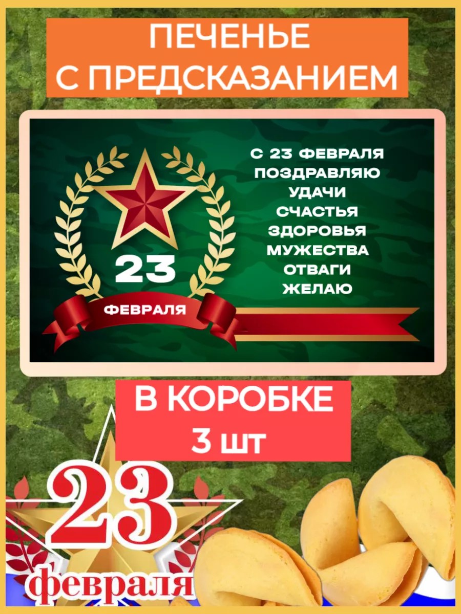 Подарочный набор печенья с предсказаниями 23 февраля. 3 шт в коробке Подарочное Праздничное Печенье с предсказаниями в подарочной коробке необычный, вкусный сувенир или подарок, который обязательно поднимет настроение и вызовет искреннюю улыбку у каждого.Оригинальный сладкий подарок презент другу, любимому,маме,сестре,внучке,бабушке,коллеге,мужу,жениху,папе,дедушке,сыну,внуку, брату,юноше,мальчику,однокласснику .В каждом печенье индивидуальное предсказание.Каждый кусочек этого печенья позволит окунуться в праздник. Этот сладкий десерт может стать отличным дополнением к подарку, ведь все любят яркие и вкусные сладости.Это уникальное и запоминающееся подарок, который может привнести в жизнь немного веселья и интриги. Используйте эти маленькие презенты как комплименты клиентам в салонах красоты, спортзале или кафе. Удивите дорогих вам людей нашим натуральным продуктом. Набор станет отличным подарком сыну, дочери или крестнику. Картонная коробка надежно защитит содержимое от повреждений. Не упустите возможность обрадовать своих детей! Подарите им море впечатлений и волшебства! бокс сладкий подарок на День Защитника Отечества для детей и взрослых. Наш подарочный набор из 3 печений с предсказаниями в подарочной коробке станет отличным подарком или презентом. вкусные,сюрприз,подарки сладости мужчине детям парню другу мужу любимому детский коллеге папе для мужчины папы для детей взрослых для парня отцу ребенку мужской брату для друга дяде коллеге внуку мальчику родственникам