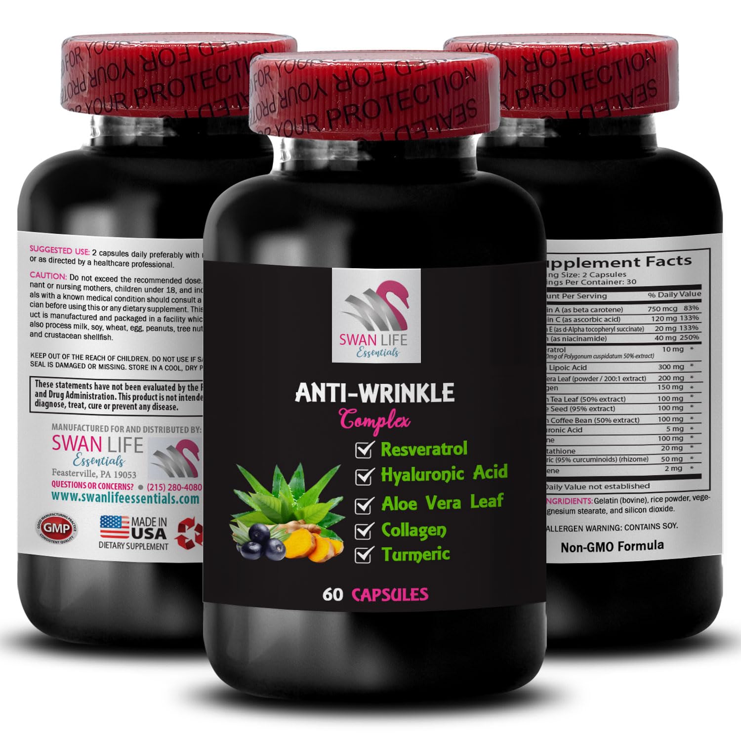 Youth Restorer - ANTI-WRINKLE COMPLEX - Anti-Wrinkle Action, Hydrating Essence, Skin Protection, Silky Smooth, Skin Vitality, Hydration Solution, Smooth Hydration 1 Bottle 60 CapsulesANTI-WRINKLE COMPLEX: Our Premium anti-wrinkle complex is made with the high-quality ingredients, Vegan, Non-Gmo, Gluten-free. This solution is safe and effective for wellness. Manufactured in an NSF certified and GMP compliant facility, SWAN LIFE ESSENTIALS ensures strict adherence to quality standards throughout the production process. ANTI-WRINKLE COMPLEX WITH GREEN TEA LEAF: Green tea is a powerhouse of antioxidants, particularly catechins, which are known for their anti-aging benefits. The high levels of polyphenols in green tea help protect the skin from UV damage and environmental stressors, which can accelerate the aging process. ANTI-WRINKLE COMPLEX WITH COLLAGEN: Collagen is the most abundant protein in the human body, playing a crucial role in maintaining skin structure, elasticity, and hydration. As we age, collagen production naturally getting lower, leading to sagging skin and the formation of wrinkles. ANTI-WRINKLE COMPLEX WITH ALOE VERA LEAF: Aloe Vera is known for its soothing and moisturizing properties, making it a staple in skincare. Rich in vitamins, minerals, and amino acids, Aloe Vera leaf extract hydrates the skin while providing nutrients that promote rejuvenation. Its properties help to calm irritated skin, reducing redness and puffiness. ANTI-WRINKLE COMPLEX WITH RESVERATROL: Resveratrol is a powerful antioxidant primarily found in the skin of red grapes, berries, and certain plants. It has gained significant attention for its anti-aging properties, particularly in skincare. Resveratrol helps to reduce oxidative stress, which is a major contributor to skin aging. ANTI-WRINKLE COMPLEX: Our powerful dietary supplement designed to support a balanced internal environment and promote optimal well-being. This advanced formula combines the natural benefits of Resveratrol, Alpha Lipoic Acid, Aloe Vera Leaf, Collagen, Green Tea Leaf, Grape Seed, Green Coffee Bean, Hyaluronic Acid, Glycine, L-Glutathione, Turmeric and Lycopene with a blend of potent ingredients known for their properties.