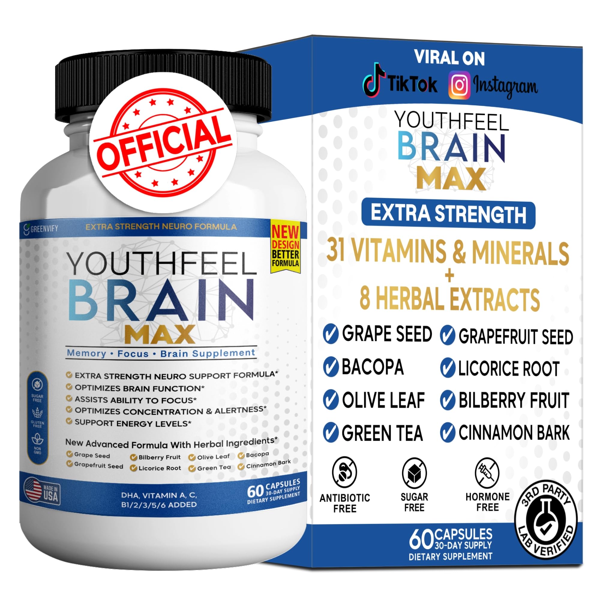 Boost Your Brainpower with YouthFeel Brain Max Stay sharp, focused, and energized with YouthFeel Brain Max – an advanced nootropic formula designed to support memory, mental clarity, and cognitive function. With a blend of powerful brain-boosting ingredients, essential vitamins, and herbal extracts, this supplement is perfect for anyone looking to enhance their mental performance. Key Benefits: Enhances Memory Focus – Bacopa, DMAE, and GABA work together to improve cognitive function and mental clarity. Supports Brain Energy Alertness – B vitamins, folate, and iron help maintain energy levels and brain health. Herbal Antioxidant Blend – Green tea, grape seed, bilberry, and licorice root provide neuroprotective benefits. Optimized for Mental Performance – Phosphatidylserine and Huperzine A help enhance concentration and alertness. Safe High-Quality Formula – Non-GMO, gluten-free, and sugar-free, manufactured in the USA under strict quality standards. How to Use: Take two (2) capsules daily with water, preferably 20-30 minutes before a meal, or as directed by your healthcare provider. Why Choose YouthFeel Brain Max? Formulated with scientifically studied ingredients, this supplement is designed to support long-term brain health while boosting daily cognitive function. Whether you're working, studying, or looking to stay mentally sharp, YouthFeel Brain Max has got you covered.Made in the USA Quality Assured – Manufactured in a GMP-certified facility, gluten-free, sugar-free, and non-GMO. Supports Concentration Alertness – Phosphatidylserine and Huperzine A help optimize concentration and mental sharpness. Powerful Herbal Blend – Includes green tea, grape seed, bilberry, licorice root, and olive leaf for neuroprotection and mental clarity. Essential Vitamins Minerals – Packed with B vitamins, zinc, folate, and iron to support brain energy and overall well-being. Advanced Brain Support Formula – Designed with DMAE, Bacopa, and GABA to promote cognitive function, memory, and focus.