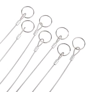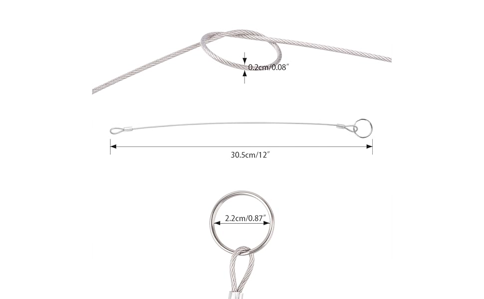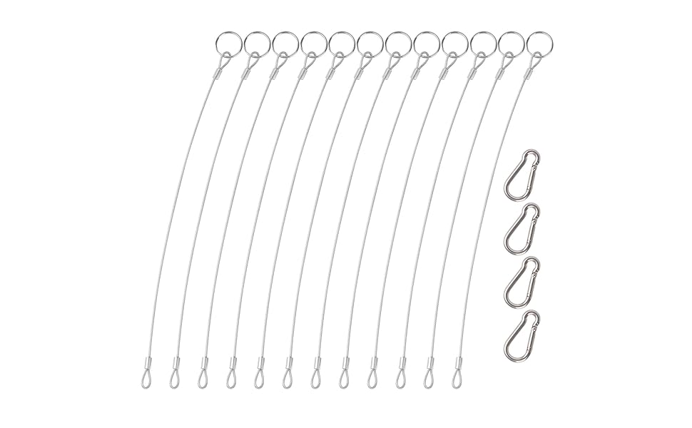 MAX LOAD BEARING:Up to 40 pounds,fast and easy to install and disassemble. EASY TO USE:The hoist buckle can be directly locked at both ends of the rope. SIZE:Rope measure 2mm/0.08in wide,30.5cm/12in long.Hoist buckle 4cm/1.57in long. HIGH QUALITY:Rope is made of high quality stainless steel with soft plastic coating.Flexible,strong,durable,and waterproof. PACKAGE CONTENTS:12 pcs 316 stainless steel lanyard safety ropes and 4 pcs 304 stainless steel hoist buckles.