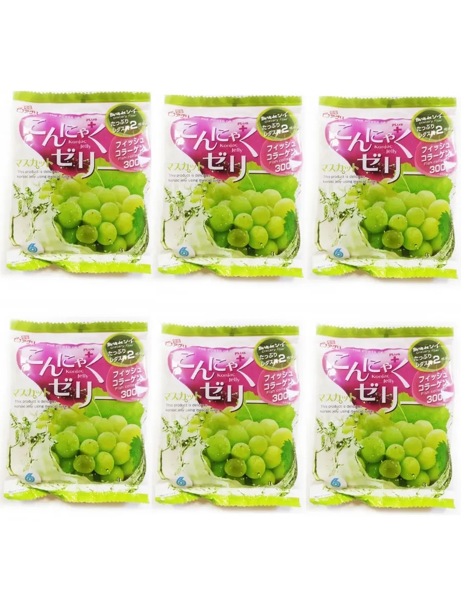 Yukigini Aguri, Konnyaku Jelly with Muscat Grape Flavor, 96 g, 6 Packets. Konnyaku (konjac) is a Japanese name for a plant containing fiber and water. It is used to produce flour, which is well-known to all Asians. It saturates well, leaving a feeling of lightness. Konjac does not contain gluten, sugar, or fat, which makes this product ideal for a diet. Ingredients: Glucose-fructose syrup, water-soluble dietary fiber, grape juice, fish collagen peptide (gelatin), konnyaku powder, gelling agent (polysaccharide thickener), acidifier, flavoring. Energy and nutritional value per 100 g: 19 kcal, proteins - 0.1 g, fats - 4.9 g, carbohydrates - 5.5 g