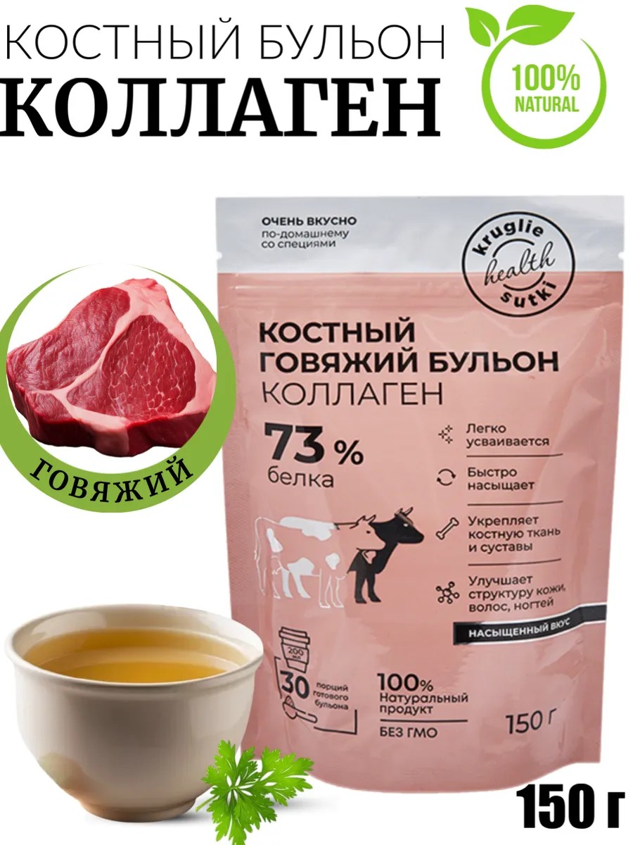 Костный бульон - это концентрированный сухой бульон с большим содержанием коллагена, включает ароматные приправы, среди которых сушеные овощи и зелень, а также соль, которая обеспечивает оптимальное ее содержание в блюде. Бульон получается прозрачным, ароматным и насыщенным вкусом. Бульон вкусный и полезный продукт, источник важных элементов для оздоровления кишечника, поддержки иммунитета, крепости суставов, улучшения состояния кожи, ногтей и волос. Состав: Гидролизованный коллаген говяжий, бульон костный пищевой сухой говяжий, пептиды коллагена говяжьего, соль, луковый порошок, масло оливковое сухое, инулин (пребиотик), петрушка сухая, укроп сухой