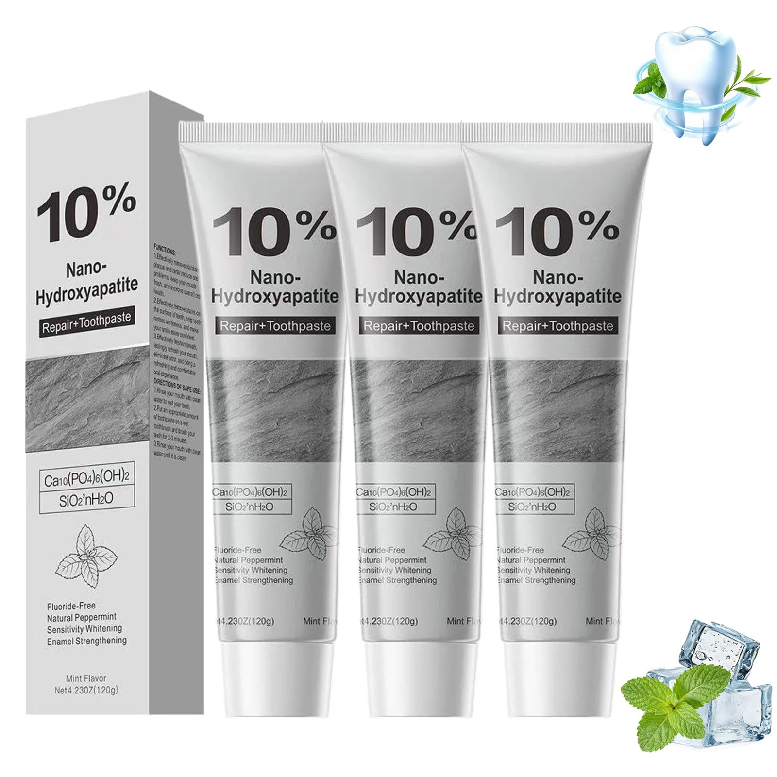 Formulated with 10 nano-hydroxylapatite, our fluoride-free toothpaste supports enamel remineralization and repair, protecting against cavities and erosion. Gentle on sensitive teeth, it provides a deep clean without irritation. Enriched with a fresh mint flavor for fresh breath, it's ideal for daily family oral care and promotes a bright smile when used regularly. : Instructions for safe use: Rinse your mouth with clean water to moisturize your teeth. Pour an appropriate amount of toothpaste onto a wet toothbrush and brush for 2 to 3 minutes. Rinse your mouth with clean water until it feels clean. Net weight: 120 g Product packaging: Box Contents: 1 3 5 toothpastes