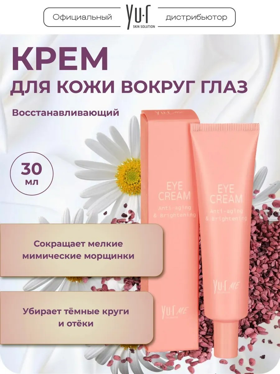 Восстанавливающий крем YUR Me для кожи вокруг глаз сокращает визуальные признаки старения кожи и работает сразу по нескольким направлениям: существенному сокращению мелких мимических морщинок и потерей упругости кожи, отечностью и темными кругами. Биоактивная формула крема ЮР ускоряет естественное обновление клеток и повышает выработку коллагена. При длительном применении морщинки и кожные заломы становятся менее заметными, кожа выглядит более молодой, упругой и ровной.