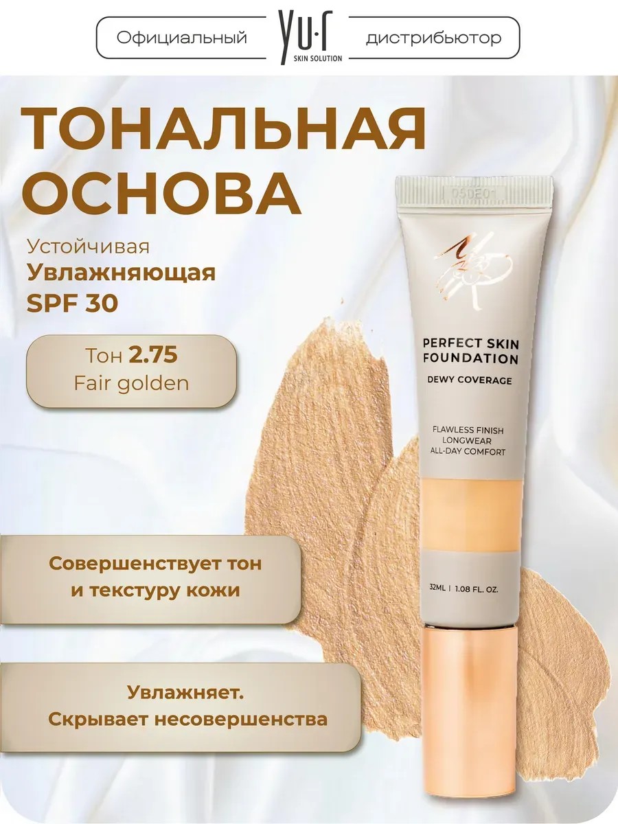 Устойчивая тональная основа увлажняющая Yu.R Dewy Coverage Foundation, тон 2.75 fair golden, 32 мл. (тональный крем).
