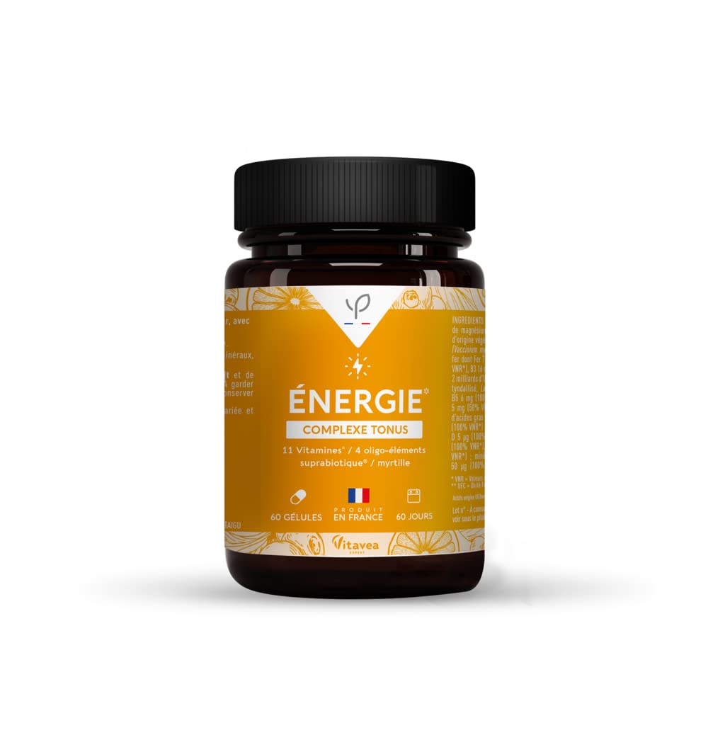 Food supplement Multivitamin - Tone and energy - 11 vitamin complex Vitamin B, Vitamin C, 4 trace elements and surpabiotics Like many people, at certain times of the year, you may feel a feeling of physical and or mental fatigue, a lack of energy despite a good night's sleep, with difficulty concentrating and memorizing information Fatigue (asthenia in medical terms) can appear in various symptoms depending on its nature: intense fatigue, temporary fatigue or chronic fatigue. Your daily life at a frantic pace, your professional, family and social obligations can lead to a point of fatigue that even 8-hour nights will not be able to relieve. When this state of fatigue persists despite rest, it is time to give your body the right nutrients to fill up with energy in order to regain your well-being and tone Recognize your level of fatigue There are two levels of fatigue. And they cannot be approached in the same way. - First, chronic fatigue, also called (Chronic Fatigue Syndrome) or CFS. This is fatigue that has been present for more than 6 months, with no apparent cause. Consultation with your doctor is essential in this case. - Then there is temporary or reactive fatigue, the one you experience most often. It is caused by a particularly intensive activity at a given time or by the arrival of less sunny seasons. This fatigue is limited in time. It is possible to relieve and even anticipate this situation with rest, a healthy lifestyle and multivitamin food supplements to stock up on good nutrients ahead of a change of season or a period of professional rush for example. Fatigue has consequences on your health Beyond an unpleasant state of drowsiness, a penalizing lack of concentration, increased irritability, fatigue alters your immune system. The body that is under diet turns out to be much less resistant to external attacks. You get sick more often, keeping your body weakened and so on. It is important not to fall into this pattern by taking appropriate measures at the first signs of fatigue. Nutrients to regain tone To anticipate an episode of fatigue or to get out of it, you can count on our Tonus complex which provides your body with a judicious combination of 11 vitamins, 4 trace elements, blueberry and 2 billion Suprabiotics. A true source of energy and resistance beneficial for all. Iron and Vitamins C and B boost your energy and support your natural defenses in the event of temporary fatigue. Vitamin D contributes to the maintenance of muscle functions and participates in the proper functioning of the immune system. The combination of copper and zinc also contributes to maintaining a good immune system. Other tips to support your ENERGY program Start by adopting routines and regular bedtimes wake-ups. Going to bed early, always at the same time, promotes a full night's sleep. And note that it is essential to sleep 8 hours per night. Find a sporting activity that you like and do it reasonably, 2 to 3 times a week. Moving your body regularly improves the quality of sleep and reduces stress. Try relaxation exercises to breathe better and relax. Also review your living environment because it impacts your level of fatigue. A noisy or polluted environment consumes energy. Go seek calm in nature from time to time to recharge your batteries. Keep the rooms in your home tidy as well because disorder affects peace of mind. Avoid smoking, which impacts your reserves of micronutrients, necessary for your physical and nervous balance. Finally, give importance to your diet because it is the main source of energy for your body. Certain lifestyles do not favor a balanced diet: takeaway meals, sandwiches, snacking between two meetings, skipping breakfast. However, it is one of the most important criteria to effectively support your Tonus treatment with our ENERGIE food supplement. For 1 capsule: Vitamin E 12 mg (100 VNR) Vitamin D 5 µg (100 VNR) Vitamin C 80 mg (100 VNR) Vitamin B1 1.1 mg (100 VNR) Vitamin B2 1.4 mg (100 VNR) Vitamin B3 16 mg (100 VNR) Vitamin B5 6 mg (100 NRV) Vitamin B6 1.4 mg (100 NRV) Vitamin B8 50 µg (100 NRV) Vitamin B9 200 µg (100 NRV) Vitamin B12 2.5 µg (100 NRV) Iron 7 mg (50 NRV) Zinc 5 mg (50 NRV) Copper 1 mg (100 NRV) Molybdenum 50 µg (100 VNR) Blueberry extract 50 mg Suprabiotic Complex 2 billion CFU during manufacturing VNR Nutritional Reference Values CFU Colony Forming Unit INGREDIENTS Ant-caking agent: magnesium carbonate vitamin C capsule of plant origin (cellulose derivative) blueberry extract (Vaccinium myrtillus) mineral: iron pyrophosphate vitamins: E, B3 Lactobacillus rhamnosus tyndallized Lactobacillus acidophilus tyndallized vitamin B5 mineral: zinc oxide anti-caking agent: magnesium salts of fatty acids mineral: copper citrate vitamin B12 vitamins D, B6, B2, B1, B9 mineral: sodium molybdate vitamin B8. DIRECTIONS FOR USE Swallow 1 capsule per day with a glass of water in the morning. SAFETY WARNING Do not exceed the recommended dose. Keep out of reach of children. Store in a dry, cool place, protected from light. To be consumed as part of a varied and balanced diet and a healthy lifestyle. CONSUME A 100 FRENCH PRODUCT: From our R D department to production, from the quality department to shipping, all PONROY expertise occupies the same premises in Montaigu, Vendée. This allows us to guarantee supplies, the quality of procedures and the control of all stages of production. Our environmentally friendly manufacturing unit follows rigorous specifications and the strictest standards so that all our products benefit from impeccable French quality. 45 YEARS OF EXPERTISE IN FOOD SUPPLEMENTS: Ponroy was created more than 45 years ago and today brings together a team of experts in the field of health and nutrition. We combine all their know-how to develop and offer the best health solutions. We understand that nutritherapy is central to staying healthy. We identify and make available to everyone the essential elements for the proper functioning of the body ac