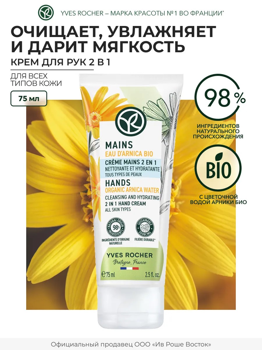 Крем для рук 2 в 1, обогащенный цветочной водой Арники БИО, очищает и увлажняет кожу рук одним жестом, не требует смывания. Его легкая текстура быстро впитывается, оставляя бархатистый финиш. Продукт дарит коже тонкий аромат и удивительное ощущение чистоты.