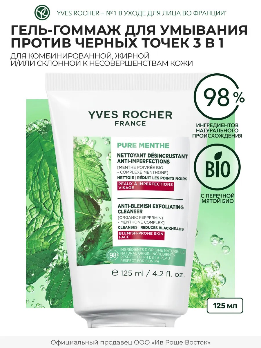 Гель Скраб Для Умывания Против Черных Точек 3 в 1 бережно очищает и отшелушивает кожу без пересушивания, очищает поры и сокращает черные точки. В состав входит Перечная Мята БИО с освежающими свойствами, выращенная на наших полях в Ля Гасийи согласно правилам агроэкологии. Гель-скраб для лица разработан для комбинированной, жирной и/или склонной к несовершенствам кожи.**Его преимущества:** освежающая гелевая текстура с микрочастицами растительного происхождения прекрасно очищает кожу.**Способ применения:** Наносите гель-гоммаж утром и вечером на влажную кожу лица, помассируйте, затем смойте. Не наносите на поврежденную или раздраженную кожу. Избегайте попадания в глаза.