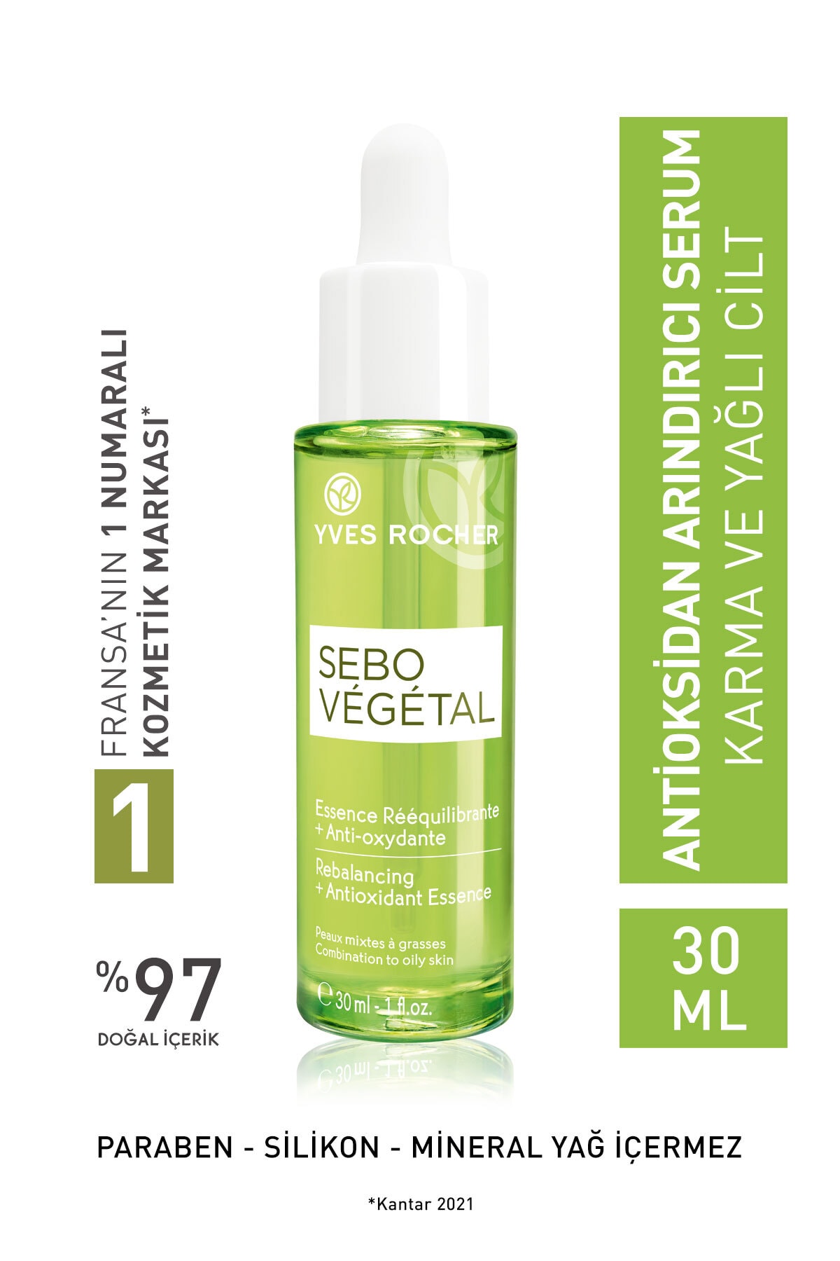 Yves Rocher Sebo Vegetal Antioxidant Oil Balancing Serum for Combination and Oily Skin - Zinc & Salicylic Acid - 30ml