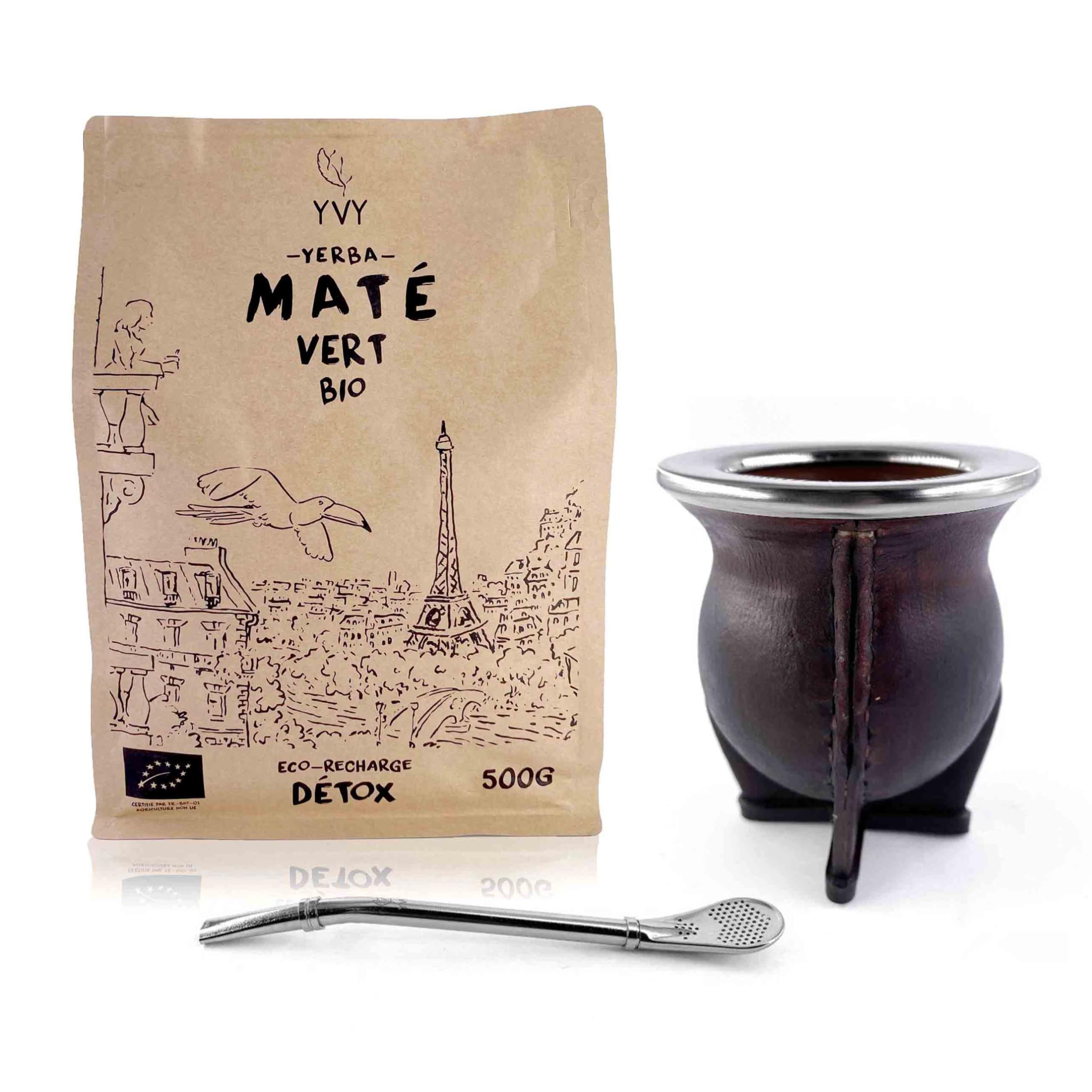 PACKAGED IN FRANCE: Our recipes are designed, blended, and packaged in France. CLASSIC STAINLESS STEEL BOMBILLA: Durable and easy to clean, it effectively filters the yerba mate for optimal enjoyment. HANDCRAFTED CERAMIC GOURD: Designed for an authentic experience, the ceramic gourd is both aesthetically pleg and functional, perfect for enjoying yerba mate. THE TRADITIONAL RITUAL: This exceptional kit, designed for discerning yerba mate enthusiasts, will impress you with its outstanding craftsmanship. The gourd is handcrafted by our partner artisan, Cristian, in Uruguay. A COMPLETE HANDCRAFTED KIT: We've included everything you need in this yerba mate kit for those looking to upgrade to exceptional handcrafted equipment. This kit consists of a ceramic camionero gourd, a classic stainless steel bombilla and 500g of Organic Green Mate.CONDITIONNÉ EN FRANCE : Nos recettes sont conçues, mélangées et conditionnées en France. BOMBILLA CLASSIQUE EN ACIER INOXYDABLE : Durable et facile à nettoyer, elle filtre efficacement le maté pour une consommation optimale. CALEBASSE ARTISANALE EN CÉRAMIQUE : Conçue pour une expérience authentique, la calebasse en céramique est à la fois esthétique et fonctionnelle, parfaite pour les dégustations de maté. LE RITUEL TRADITIONNEL : Ce kit d'exception, pensé pour les amateurs de maté avertis saura vous désuire par la qualité exceptionnelle de fabrication. La calebasse est confectionnée à la main, par notre artisan partenaire Cristian en Uruguay. UN KIT COMPLET ARTISANAL : Nous avons réuni dans ce kit à maté tout le nécessaire pour les amateurs souhaitant passer à un équipement d'exception artisanal. Ce kit est composé d'une calebasse camionero céramique, d'une bombilla classique en inox et de 500g de Maté Vert Bio.YVY MATÉ Kit Maté Camionero Céramique Pack Calebasse Céramique, Bombilla classique et 1 poche de Yerba Mate Vert Bio 500g Ensemble de maté facile Fabrication Artisanale en Uruguay