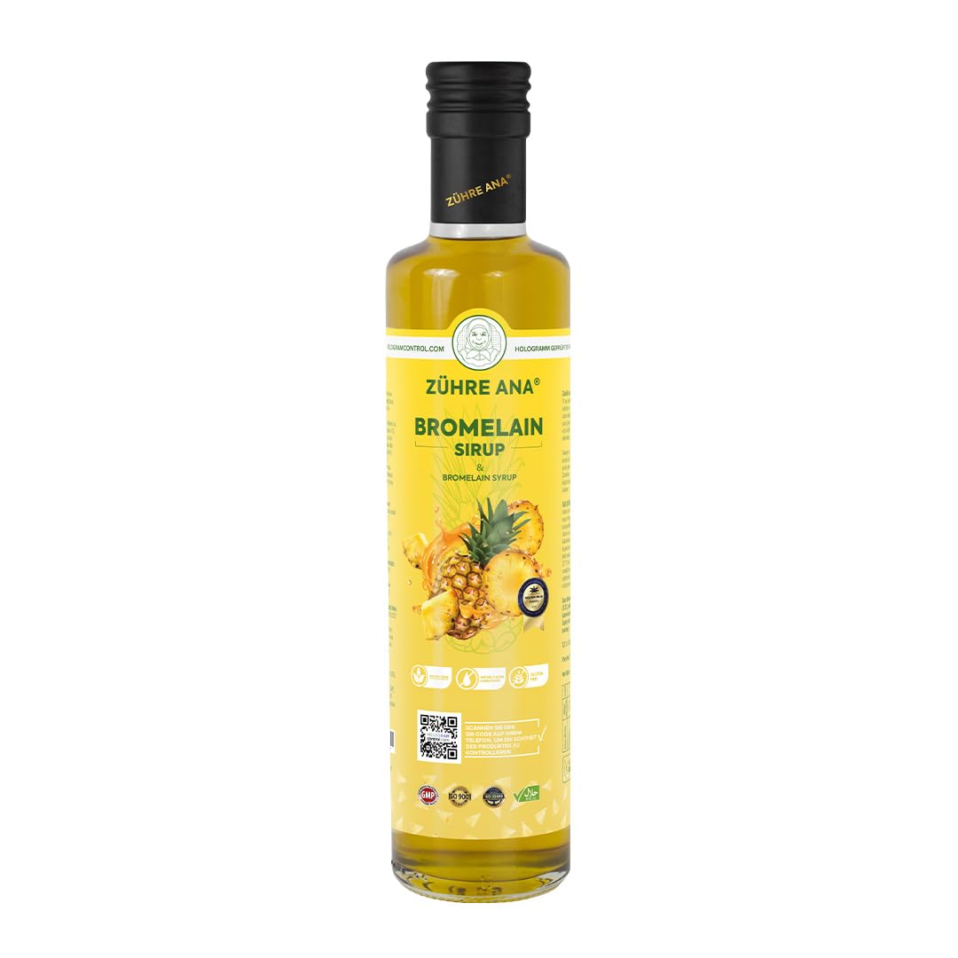 : Zühre Ana Bromelain Syrup (250 ml) – Natural support with valuable ingredients. Ana Bromelain Syrup blends carefully selected ingredients in a special recipe with a natural pineapple flavor. Enriched with bromelain and coenzyme Q10, this syrup provides valuable daily support. Enhanced with mate leaf extract, L-carnitine, and vitamin C, it offers a simple and natural way to support your well-being. Sweetened with stevia and free of artificial additives, the syrup impresses with its pure composition. Directions for use: Take one tablespoon twice a day – morning and evening – on an empty stomach. You can drink the syrup undiluted or enjoy it diluted in water as desired. Ingredients: Deionized water, bromelain, coenzyme Q10, yerba mate leaf extract, L-carnitine, acacia gum, L-ascorbic acid (vitamin C), pineapple extract, natural pineapple flavor, stevia (Stevia rebaudiana).