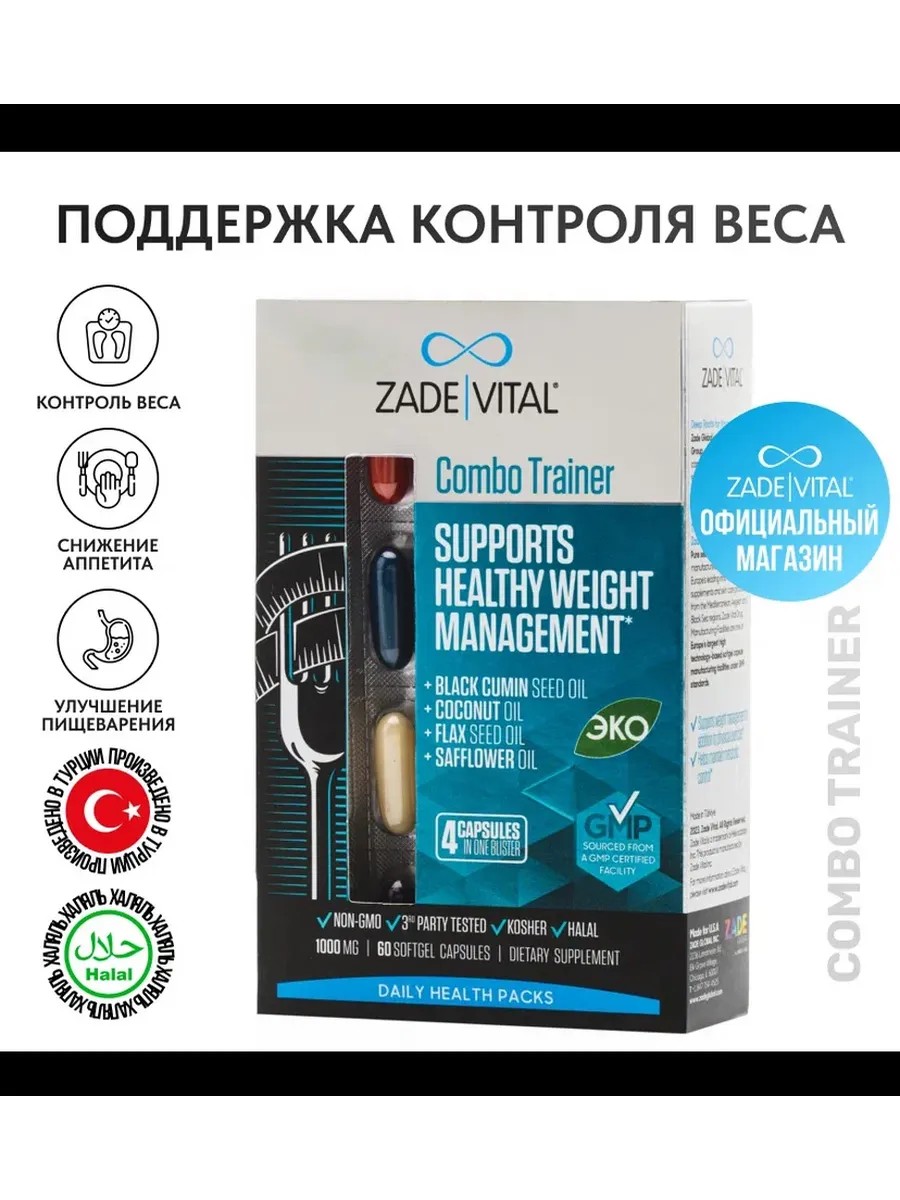 Combo Trainer by Zade Vital is a vitamin complex in soft capsules, created specifically for adult men and women who want to maintain their health and control their weight. These Turkish capsules contain the power of 4 oils, as well as Omega 3-9, vitamins (A, D, E), minerals, and trace elements, which promote a healthy metabolism and improve the body's performance.