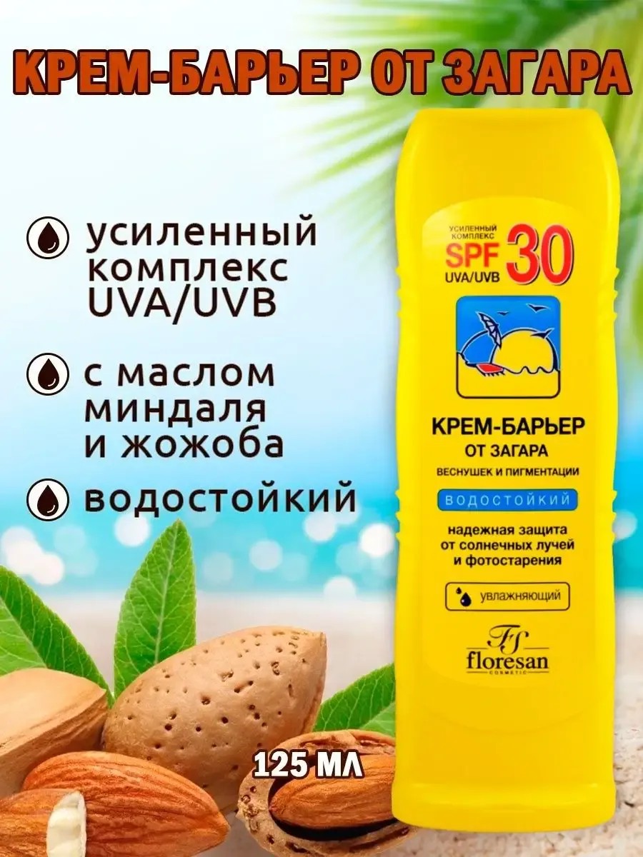 Крем барьер SPF 30 разработан специально для защиты от загара и пигментации в период повышенной солнечной активности. Усиленный комплекс UVA и UVB фильтров солнцезащитного крема обеспечивает максимальную защиту кожи от воздействия прямых солнечных лучей. Крем от загара полностью блокируют процесс выработки меланина, являющегося главным фактором появления загара, пигментных пятен и веснушек. Крем солнцезащитный обогащен натуральными маслами: кокосовым, миндальным и жожоба, которые усиленно питают и увлажняют кожу, подвергшуюся инсоляции. Крем предупреждает фотостарение. Средство от загара легко наносится и быстро впитывается. Крем барьер от загара с спф 30 имеет нежную кремовую консистенцию белого цвета, легкий аромат. Крем подходит для солярияКрем защитный от солнца незаменим даже в холодное время года. Его необходимо наносить за 15 минут до выхода на солнце. Солнцезащитный крем водостойкий, но рекомендуется обновлять его после 2-3 купаний или каждые 2-3 часа на солнце.