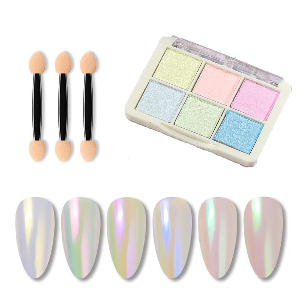 Préparez vos ongles avec la couleur de base, utilisez un bâton de maquillage pour prendre la poudre et la briser sur vos ongles après que le gel soit complètement sec (répétez l'étape jusqu'à ce que vous soyez satisfait de l'effet), scellez avec une couche de finition, laissez durcir sous une lampe LED UV (utilisez une couche de finition sans essuyage pour obtenir un effet miroir). Il montre comme un style de perle lorsque vous l'appliquez avec un gel de base blanc, l'éclat brillant de la couleur irisée change avec l'éclairage et les angles de vue. Il peut également être assorti à la plupart des couleurs de vernis gel pour créer des résultats variés. Avec 3 bâtons de maquillage pour une meilleure fabrication de nail art. Il est facile à utiliser et à transporter avec l'étui de rangement. 6 couleurs pour plus de styles de nail art.