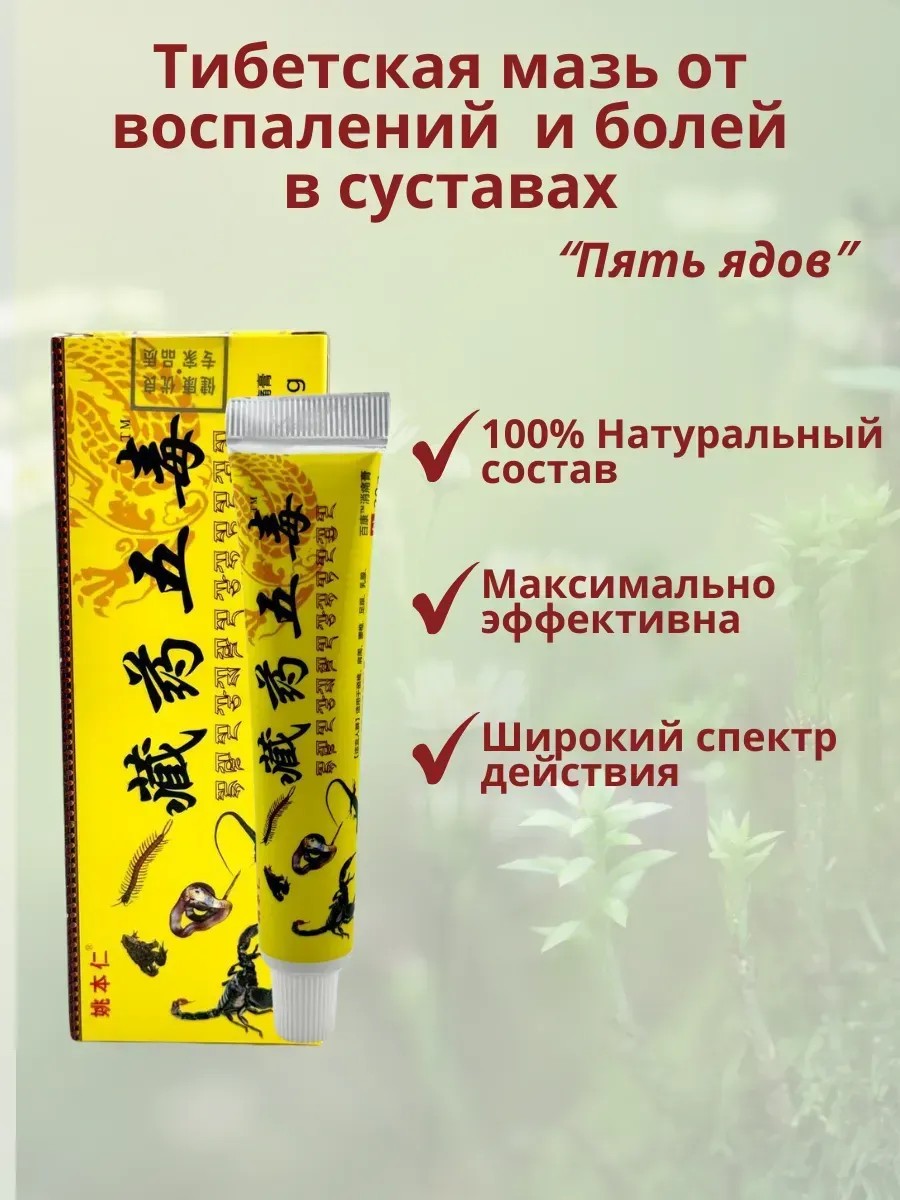 Натуральная противовоспалительная мазь «Пять ядов» 20г — это натуральное обезболивающее и антисептическое средство для суставов и кожи. Обезболивающая антисептическая мазь «Пять ядов» — уникальное средство, основанное на древних рецептах тибетской медицины. Содержит натуральные компоненты - мощное противовоспалительное средство.