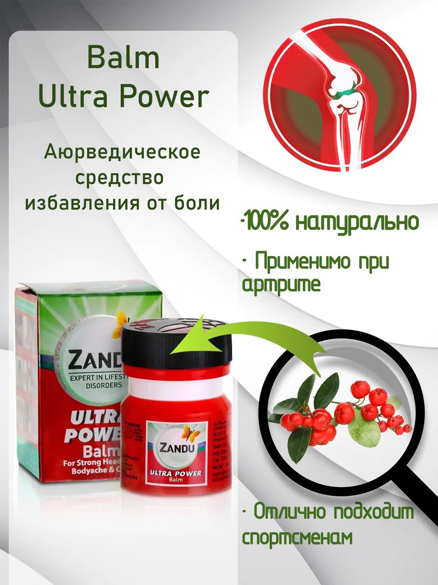 Хорошо известный в Индии бальзам Zandu зарекомендовал себя как прекрасное болеутоляющие средство для наружного применения. Бальзам Zandu состоит из натуральных высокоэффективных компонентов, которые помогают при головных болях и болях от растяжений связок, напряжения, артрита, подагры, болях в пояснице, ушибов и спортивных травм, при простуде,укусах.