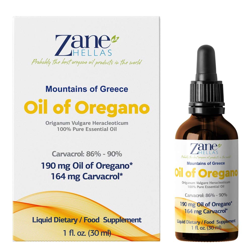 Zane Hellas 100 Undiluted Oregano Oil. Pure Greek Essential Oil of Oregano .86 Min Carvacrol. 164 mg Carvacrol Per Serving. Probably the Best Oregano Oil in The World. 1 fl. oz.- 30ml.