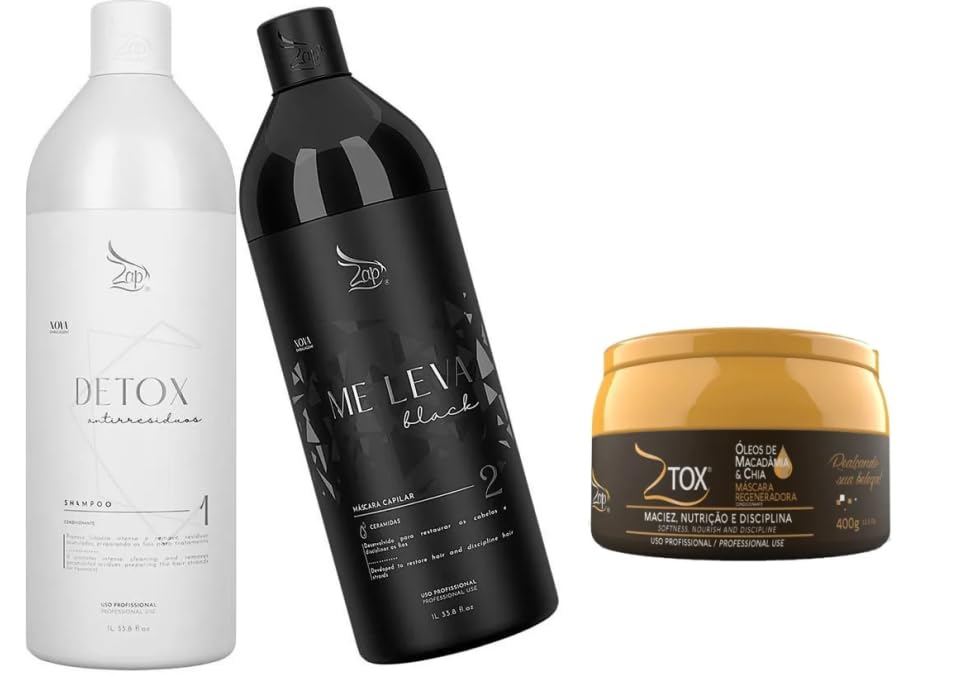 The ZAP Me Leva Keratin treatment replaces our well-known ZAP ALL TIME Keratin treatment. You can only purchase ZAP Me Leva from us, a recognized supplier of ZAP Cosmetics in the Benelux region. ZAP is one of the most recognized brands in Brazil, with over 15 years of experience in the cosmetics market. It is a top-selling product approved by thousands of professionals and clients throughout Brazil. Suitable for all hair types and compatible with any chemical, it makes hair shiny and up to 90 straighter, reduces volume by up to 90 , and provides an instant smooth effect. This keratin treatment eliminates frizz while hydrating, nourishing, and rebuilding the hair fiber. Me Leva is a 100 effective treatment designed to treat deeply and intensely damaged hair. Me Leva is made with Macadamia and Coconut Oil, which provides a boost of nutrients, promotes extreme shine, softness, alignment, and more. How to use: -Apply Zap Me Leva Deep Cleansing Shampoo to wet hair and massage from root to tip, then rinse thoroughly. Repeat up to 4 times. On the third application, leave the shampoo on your hair for 15 minutes and then rinse. -Part hair into 4 sections and apply Zap Me Leva Hair Treatment from strand to strand, starting at the nape of the neck, keeping a minimum distance of 1.5 cm from the root. -After applying step 2, remove excess product by blow-drying hair. Use your desired temperature, which can be cold or warm. Line the strands with a brush to remove any tangles. -To complete the process, style hair with a flat iron, an average of 15 to 20 times on each strand. Watch the instruction video on our website. Wait until your hair has cooled, then wash it with your preferred shampoo and conditioner. AND YOU'RE DONE! Your hair is super straight, hydrated, and beautiful. NOTE: ZAP Me Leva Keratin is exclusively for professional hairdressers. We are not responsible for any results resulting from the use of these products by non-professionals. You must always wear a mask and gloves. The area must also be well ventilated during the application process. Read the instructions carefully before using the product. Ztox Professional Regenerating Mascara is a controlled treatment, indicated for all hair types, especially damaged and frizzy hair. Ztox Zap Professional is a hair mass replenishing mask, designed to hydrate and reduce hair volume. Ztox Professional Regenerating Mascara is compatible with all types of chemistry its formula contains a combination of amino acids, silicone, panthenol, macadamia oil, and chia that restores hair's beauty, leaving strands extremely silky and resistant. Ztox Professional Regenerating Mascara promotes fully regenerated hair, with intense shine and definition, thanks to Nanofix technology that works from within and rebuilds the entire hair fiber. How to use: Wash your hair twice with an anti-residue shampoo to remove residue, preventing full lather. Rinse thoroughly. Apply Ztox Mascara Regeneradora Professional to thin strands, working from roots to ends, keeping a distance of 1.5 centimeters. Leave on for 30 minutes and rinse. Dry your hair and style 15 to 20 times in thin strands. 100 Brazilian product. Contains: ZAP Me Leva Shampoo - 1 L ZAP Me Leva Hair Mask - 1 L Zap Ztox Mascara Regenerating Oil Macadamia Chia 400g. NOTE: Products that are being returned and show signs of heavy use that are no longer in a saleable condition will not be accepted. AVERTISSEMENT DE SÉCURITÉ Garder hors porter des enfantsMoisturizing.Zap Me Leva Traitement brésilien à la kératine 2x1L mascara Ztox Huile de régénération Macadamia Chia 400gDESCRIPTION DU PRODUIT DESCRIPTION DU PRODUIT ZAP Me Leva Keratine behandeling is de vervanger van ons bekende ZAP ALL TIME Keratine behandeling. U kunt ZAP Me Leva alleen bij ons kopen als erkend leverancier van ZAP Cosmetics in Benelux. ZAP is een van de meest bekende merk in Brazilië, met meer dan 15 jaar ervaring in de cosmetische markt, is het een van de meest verkochte en goedgekeurde product door duizenden professionals en klanten in heel Brazilië. Aangepast voor alle haartypes en compatibel met elk type chemische stof,het maakt het haar glanzend en tot 90 steiler en geeft tot 90 volumevermindering en onmiddelijk glad effect op het haar. Deze keratine behandeling elimineert pluizig haar terwijl het de haarvezel hydrateert, voedt en opnieuw opbouwt. Me Leva is een 100 effectieve behandeling die is ontworpen om diep en intens beschadigd haar te behandelen. Me Leva bevat Macadamia en kokosolie, die je een beetje voedingsstoffen geeft, extreme glans, zachtheid, uitlijning en meer bevordert. Hoe te gebruiken: -Pas Zap Me Leva diep reinigende shampoo aan op nat haar en masseer het haar van wortel tot punt, spoel daarna het haar grondig uit. Herhaal dit tot 4 keer. Laat de shampoo de derde keer gedurende 15 minuten op je haar inwerken en spoel het daarna uit. - Verdeel het haar in 4 delen en breng Zap Me Leva Hair Treatment van streng tot streng aan, beginnend bij de nek, met een minimale afstand va 1,5 cm vanaf de wortel. -Na toepassing van stap 2 verwijder overtollig product door het haar droog te föhnen. Gebruik het gewenste temperatuur, dit mag koud of warm zijn. Lijn de strengen uit met een borstel om eventuele klitten te verwijderen. -Om het proces te voltooien stijl je het haar met een stijltang, gemiddeld 15 tot 20 keer op elke streng . Bekijk de instructie video op onze website. Wacht tot het haar is afgekoeld en was het vervolgens met de gewenste shampoo en conditioner. EN KLAAR! Het haar is super steil, gehydrateerd en mooi. LET OP: ZAP Me Leva Keratine is exclusief voor professionele kappers. Wij zijn niet verantwoordelijk voor resultaten die voortvloeien uit het gebruik van deze producten door niet-professionals. U dient ten alle tijden gebruik te maken van een masker en handschoenen. Tevens dient de ruimte goed geventileerd te worden tijdens de behandeling van het product. Lees de handleiding aandachtig voordat u het product g