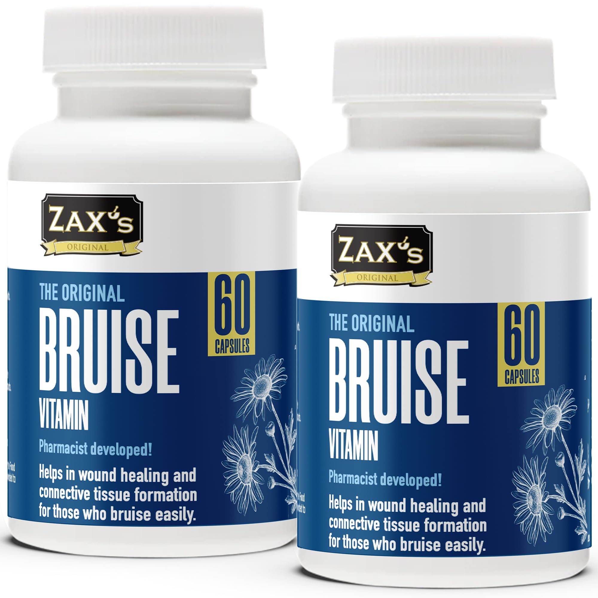 Zax's Original Bruise Vitamin 2-Pack – Double the Support for Healthier Skin Experience the power of Zax's Original Bruise Vitamin in this convenient 2-pack, delivering 120 capsules of pharmacist-developed skin support. Perfect for those prone to bruising or seeking a natural boost to their skin care routine, this formula harnesses a blend of essential vitamins and minerals to reduce bruising, swelling, and redness. Why Choose the 2-Pack? - Enhanced Value: Get 120 capsules for longer-lasting bruise relief and skin health support. - Potent Formula: Features Vitamin C, D3, K1, Zinc, and Citrus Bioflavonoids—known for their roles in collagen synthesis, circulation, and antioxidant protection. - Quality You Can Trust: Made in a GMP-certified facility, gluten-free, and backed by a Canadian family business since 2007. Benefits of Zax's Bruise Vitamin: - Reduces the appearance of bruises and swelling with daily use. - Supports skin recovery and resilience with science-backed nutrients. - Complements your routine—pair with arnica bruise cream for maximum results. How to Use: Take one capsule daily with food. Allow a few hours before or after other medications or supplements. Consult a healthcare professional if you're on blood thinners or have specific health concerns. Why Zax's Original? Founded in 2007, our Canadian team of chemists, botanists, and pharmacists crafts no-nonsense, natural solutions for your skin. This 2-pack ensures you're stocked up for consistent care—because healthy skin shouldn't wait. Search no further—Zax's Original Bruise Vitamin 2-Pack is your go-to for bruise relief and vibrant skin health!TRUSTED CANADIAN SKIN CARE SINCE 2007 - Zax's Original combines traditional wisdom with modern science. This gluten-free, pharmacist-developed formula from our family-owned company offers fast, effective bruising relief you can rely on. POTENT EASY-TO-USE 2-PACK - Transform your skin with one daily capsule from this 120-count bundle. Take with food, and space it a few hours from other meds or supplements. Consult your doctor if on blood thinners—quality and safety come first!. HEALTHIER, STRONGER SKIN - Zinc Citrate and Citrus Bioflavonoids deliver powerful antioxidants to protect your skin from damage, soothe irritation, and reduce redness. Maintain a youthful, resilient complexion with this daily supplement. BOOST SKIN RECOVERY WITH ESSENTIAL NUTRIENTS - Packed with Vitamin C, D3, and K1, this formula supports collagen production and circulation—key for wound recovery. Citrus Bioflavonoids enhance the blend, helping your skin bounce back faster. BRUISE LESS, HEAL FASTER – 2-PACK VALUE - Tired of easy bruising? This 120-capsule twin pack offers double the support to reduce bruising, swelling, and pain. Pharmacist-crafted with proven vitamins and minerals, it's perfect for sensitive skin at any age—stock up and save!.