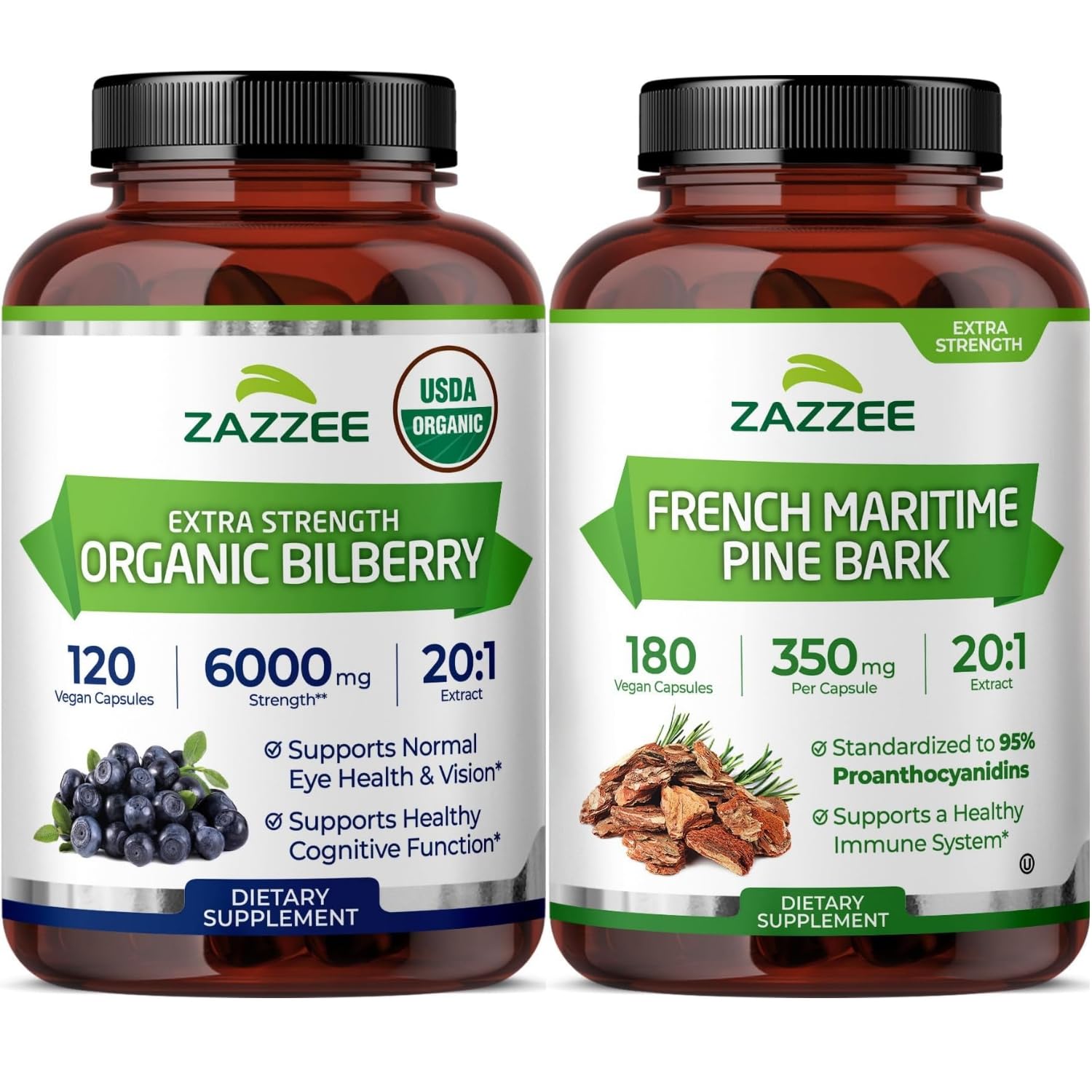 Zazzee French Maritime Pine Bark Extract and Organic Bilberry Extract Capsules | 20:1 Bilberry Supplement Plus French Pine Bark | Circulatory Support Bundle
