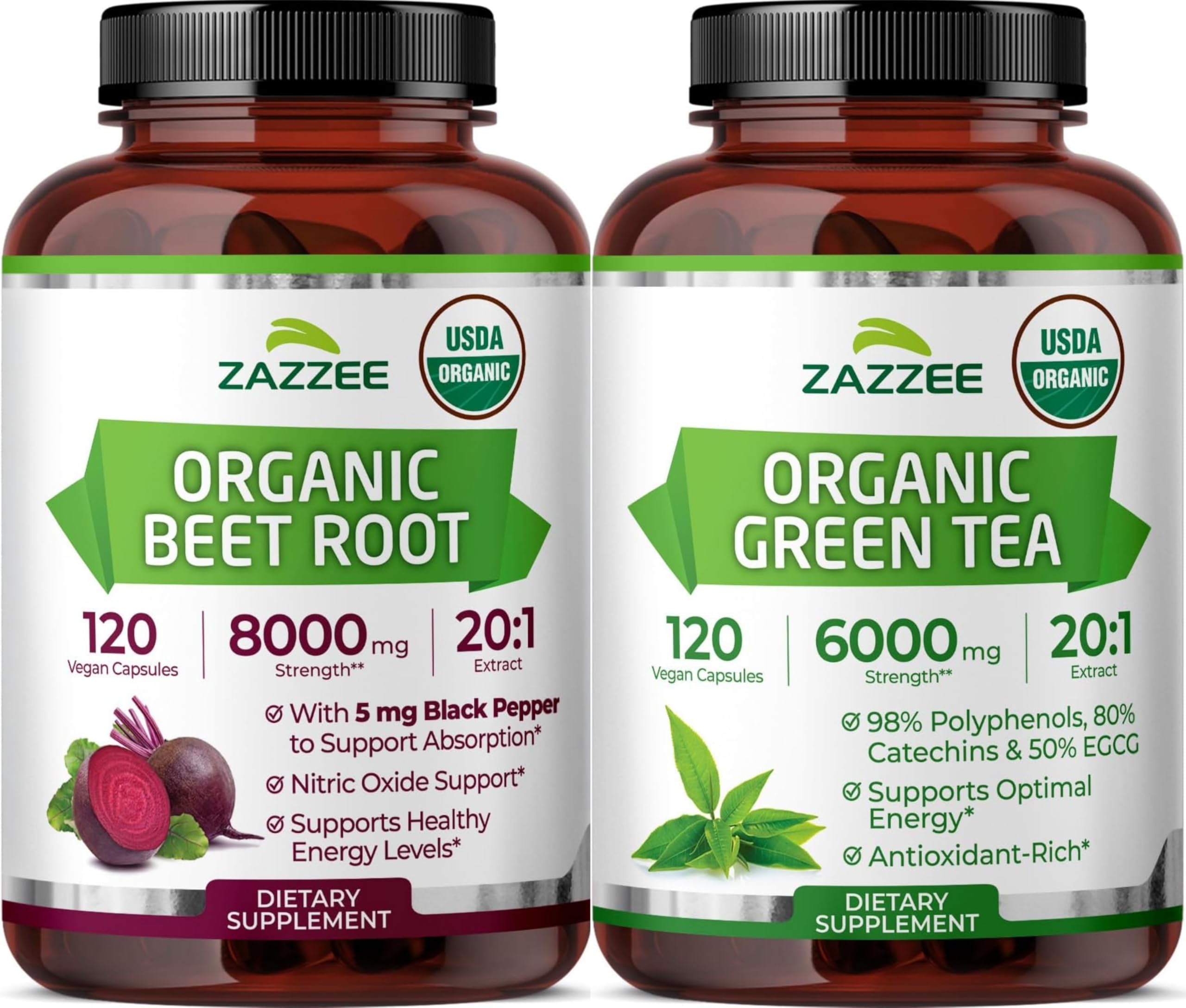 Zazzee Herbal Antioxidant Fitness Support Bundle | 20:1 Organic Green Tea and Beet Root Extract Capsules | Non-GMO Vegan & ISO Lab Tested (120 Servings Each)
