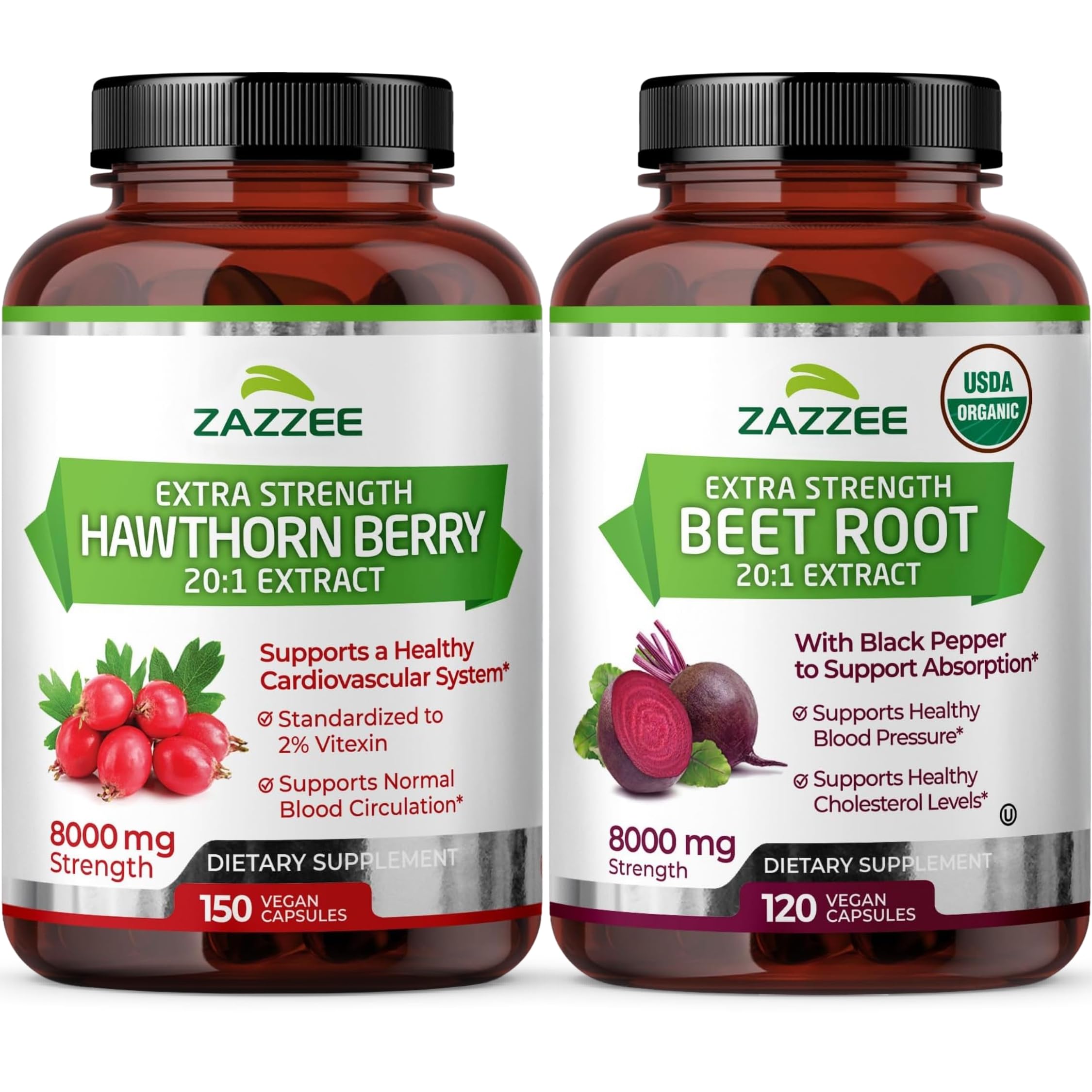 Zazzee Herbal B Pressure Support Bundle | 20:1 Organic Beet Root Capsules & 20:1 Extra Strength Hawthorn Berry Capsules | Non-GMO Vegan & ISO Lab Tested
