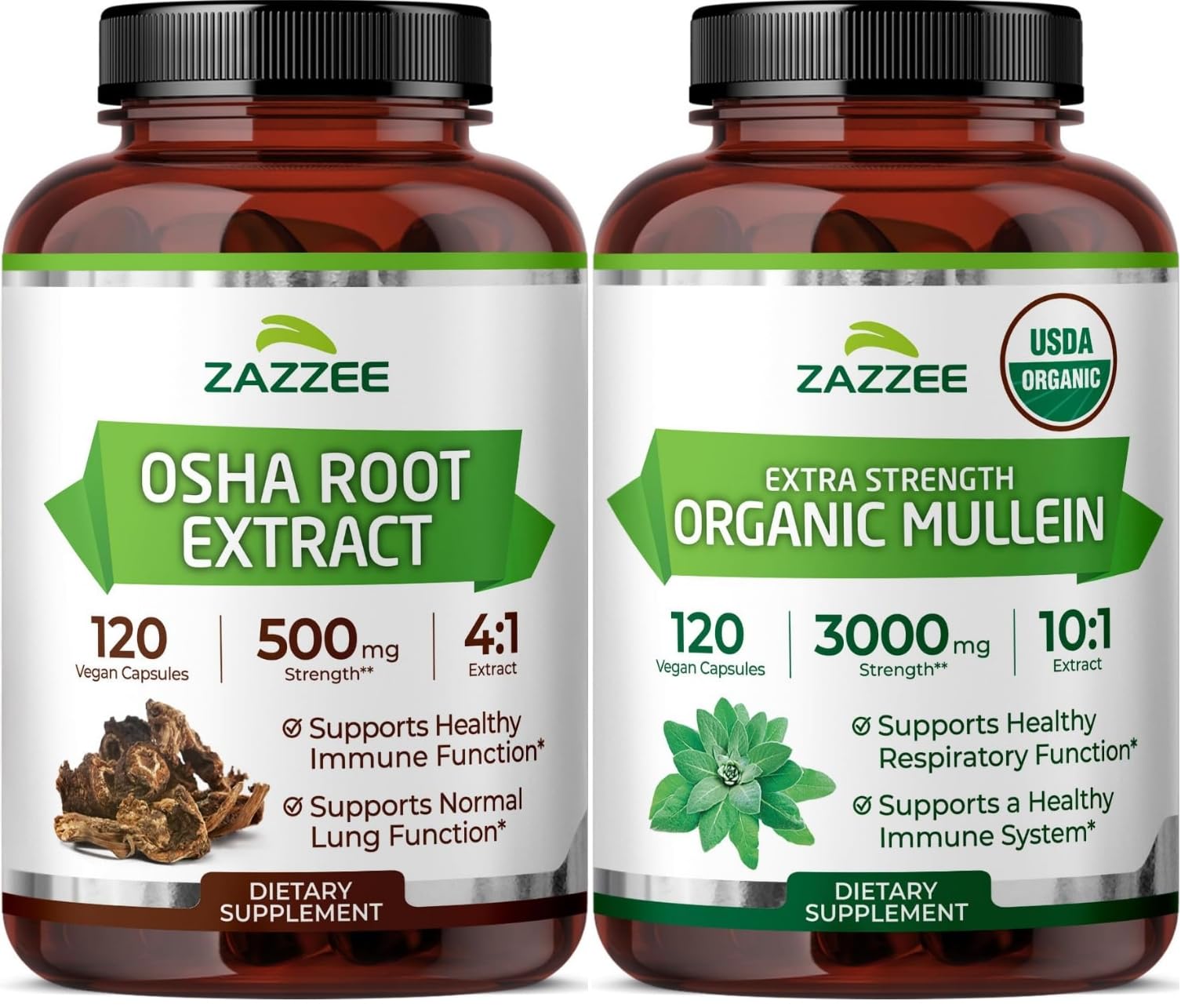 Zazzee Herbal Respiratory Lung Health Support Bundle | Organic Mullein Leaf Extract Plus 4:1 OSHA Root Extract Capsules | Non-GMO Vegan & ISO Lab Tested (120 Servings Each)