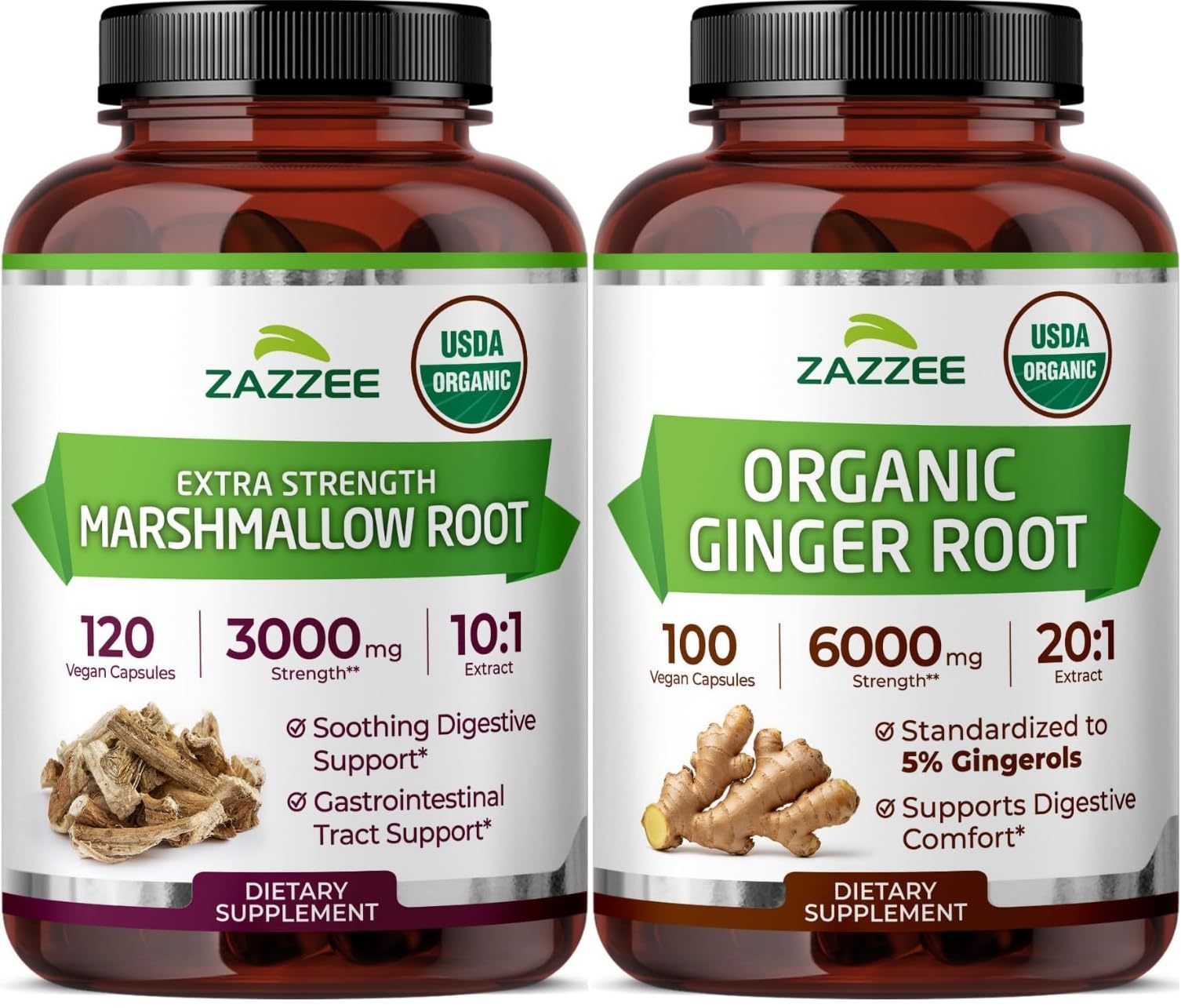 Zazzee Organic Digestive Comfort Support Bundle | 20:1 Ginger Root Extract Plus Marshmallow Root Capsules | Non-GMO Vegan & ISO Lab Tested