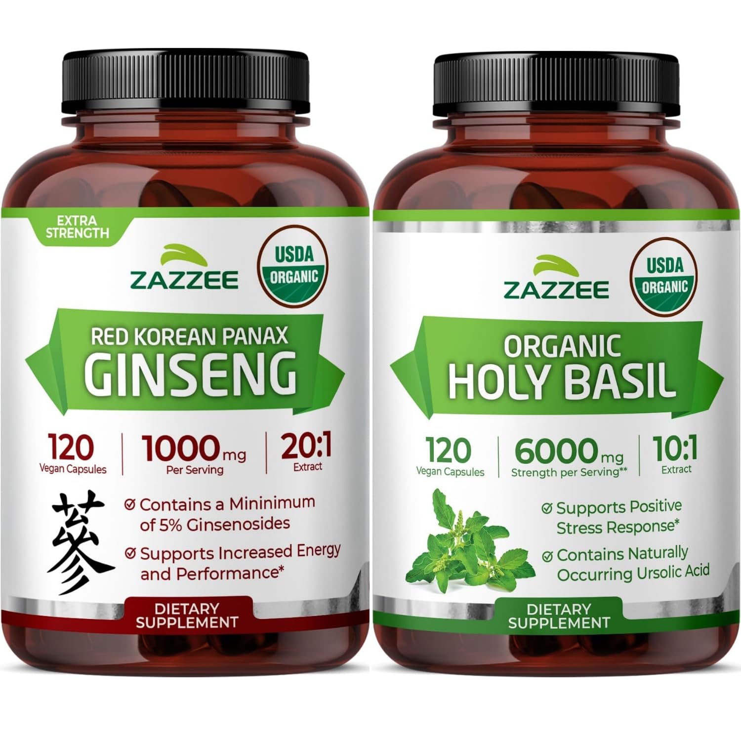 Zazzee Organic Holy Basil and Korean Panax Ginseng Extract Capsules | 10:1 Tulsi Holy Basil Extract Plus 20:1 Ginseng Supplement | Adaptogen Support Bundle