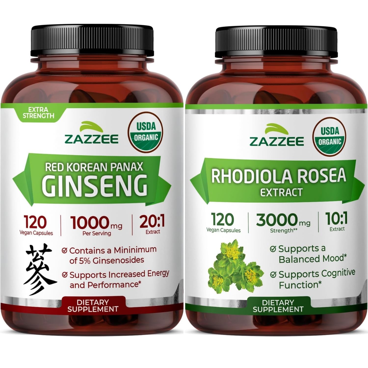 Zazzee Organic Rhodiola Rosea and Korean Panax Ginseng Extract Capsules | 10:1 Rhodiola Rosea Extract Plus 20:1 Ginseng Supplement | Adaptogen Support Bundle