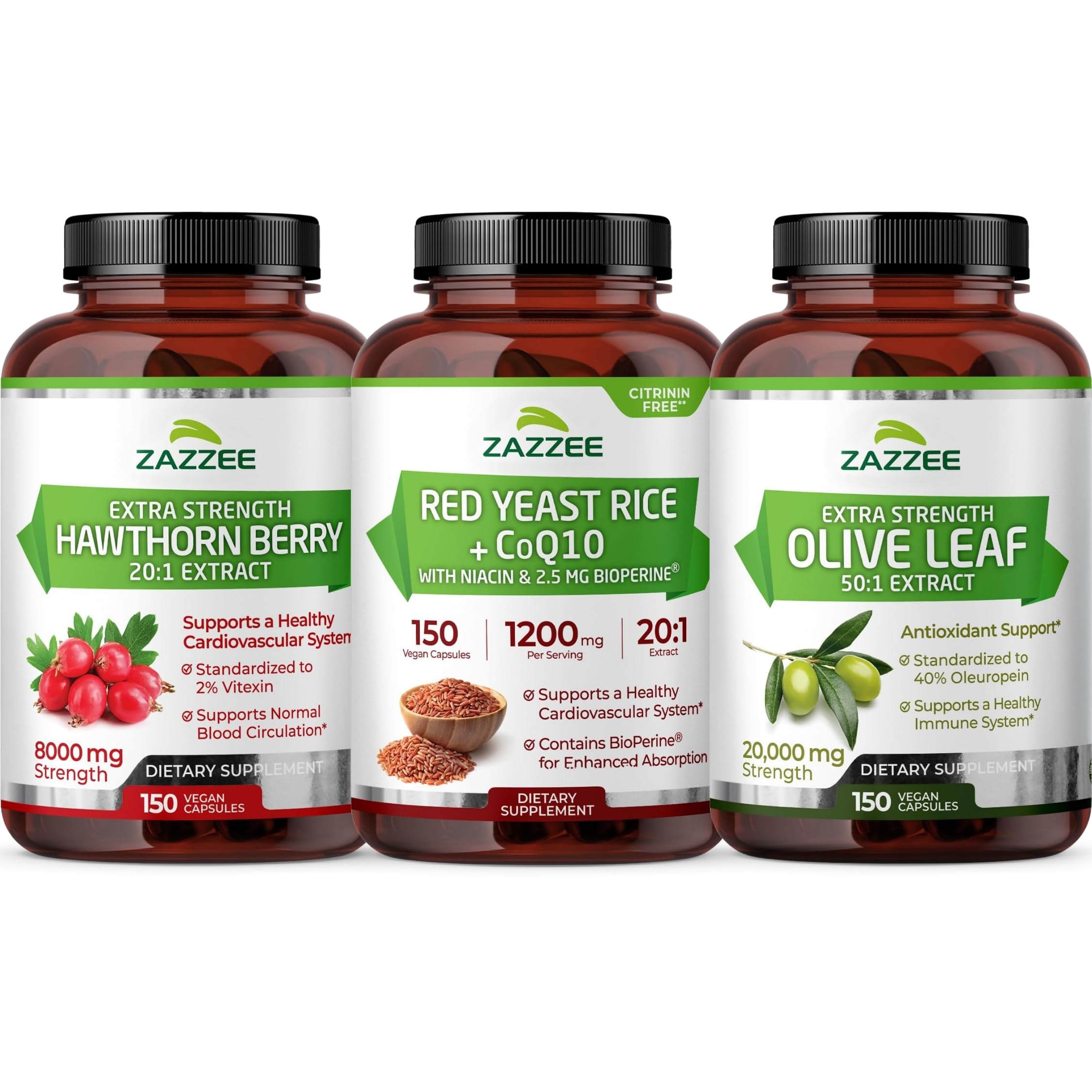 Zazzee Ultimate CardioVascu Support Bundle | Red Yeast Rice with CoQ10 Plus 50x Concentrated Olive Leaf Extract & 20:1 Extra Strength Hawthorn Berry Capsules | Non-GMO Vegan & ISO Lab Tested