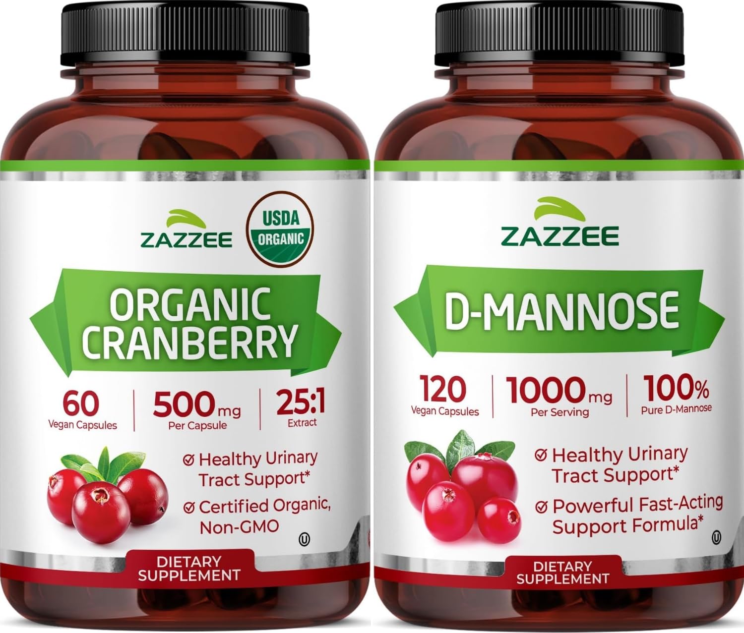 Zazzee Urinary Tract Cleanse Bundle | Fast Acting D-Mannose 1000mg Capsules Plus USDA Organic Cranberry Extract Capsules for Women | Non-GMO Vegan & ISO Lab Tested (60 Servings Each)