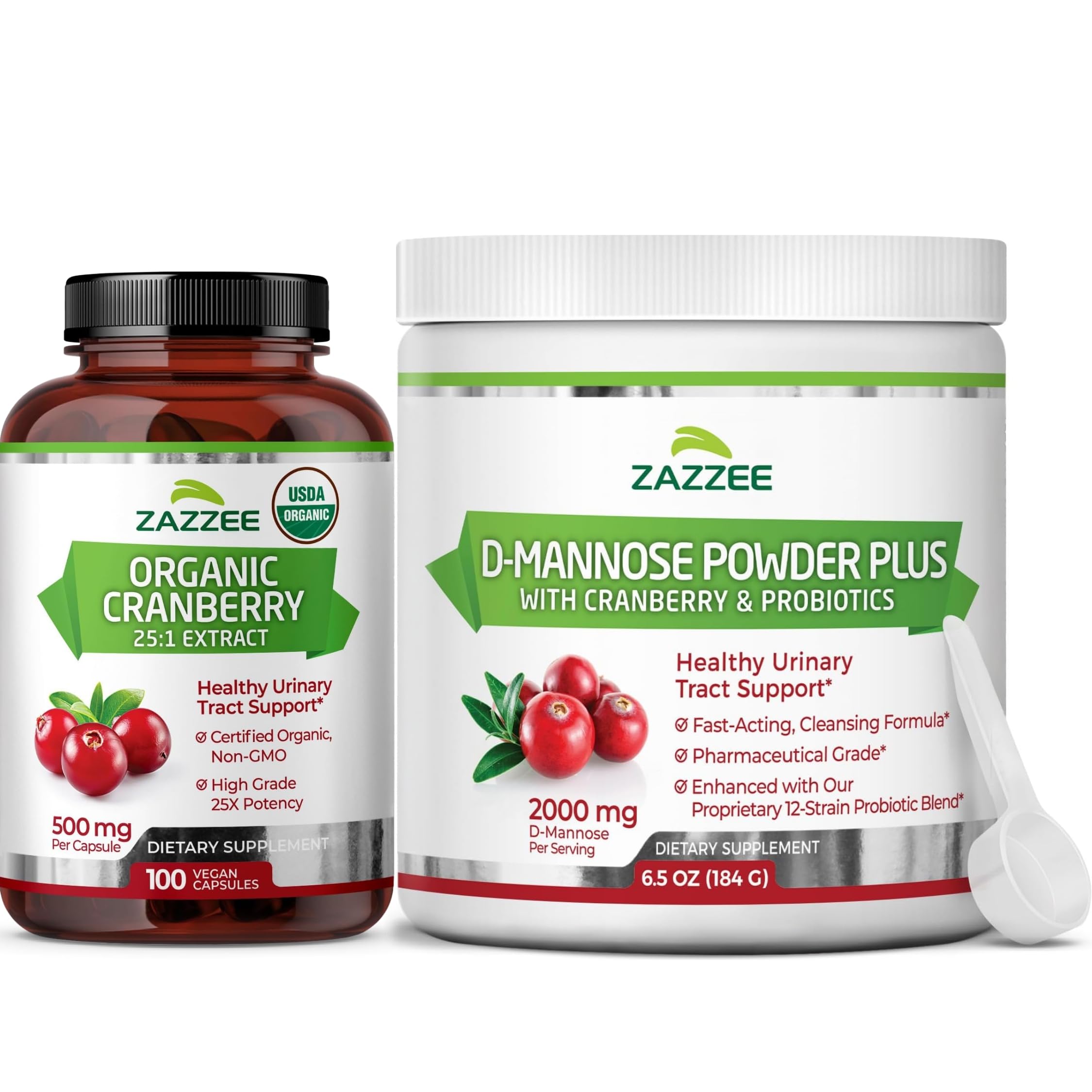 Zazzee Urinary Tract Cleanse Bundle | Fast Acting Probiotic Cranberry D Mannose Powder Plus 25:1 USDA Organic Cranberry Extract Capsules for Women | Non-GMO Vegan & ISO Lab Tested