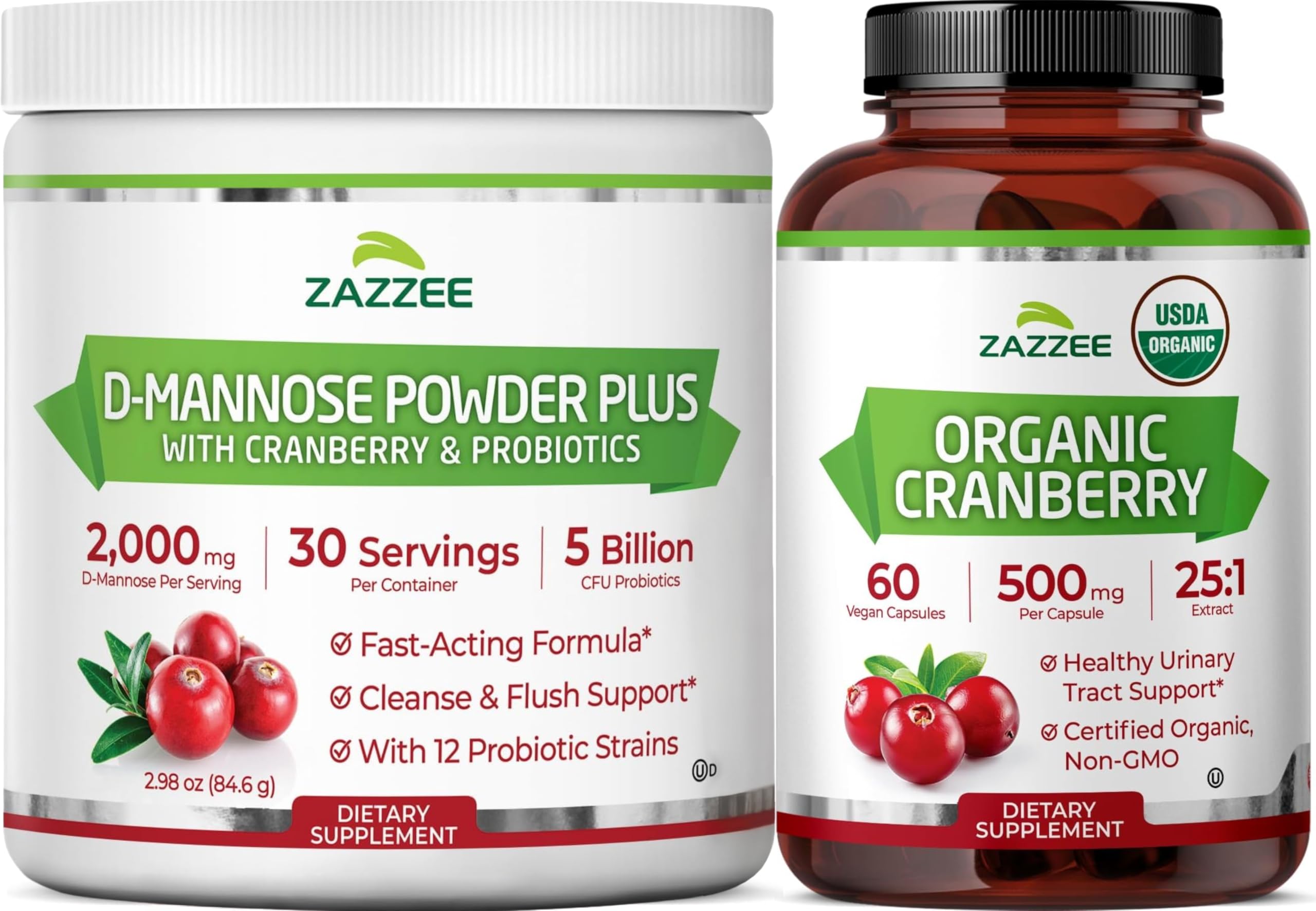 Zazzee Urinary Tract Cleanse Bundle | Fast Acting Probiotic Cranberry D Mannose Powder Plus USDA Organic Cranberry Extract Capsules for Women | Non-GMO Vegan & ISO Lab Tested