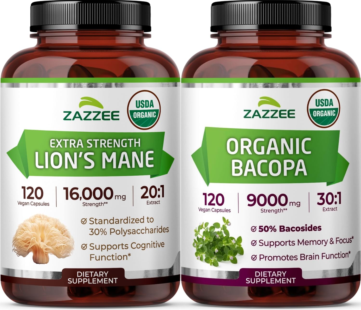 Zazzee USDA Organic Cognitive Support Bundle | 30:1 Bacopa Monnieri Extract Plus Lions Mane Extract Capsules | Non-GMO Vegan & ISO Lab Tested (120 Servings Each)