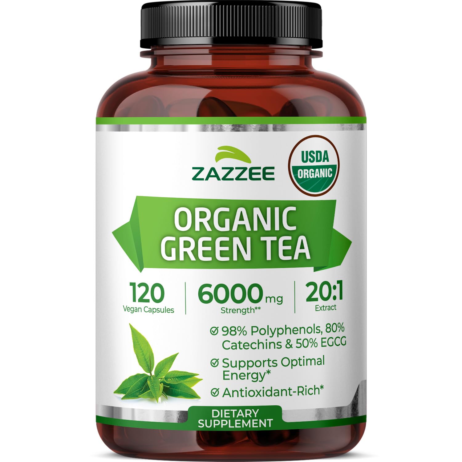 GOLD STANDARD PRODUCTION: Your health and safety mean everything to us. For that reason, our Organic Green Tea Extract is manufactured in the USA, in a fully compliant facility with adherence to good manufacturing policies and under the most stringent quality control. You can rest assured that you get the best value for your money!. 6000 MG STRENGTH 20:1 EXTRACT: Each capsule contains 6000 mg strength of Organic Green Tea Extract from a potent, powerful 20:1 extract. Combine that with a minimum of 50 EGCG, 80 Catechins and 98 Polyphenols, and our Organic Green Tea Extract is one of the strongest dosages available!. 50 EGCG, 80 CATECHINS AND 98 POLYPHENOLS: Our Organic Green Tea Extract has been standardized to contain a minimum of 50 EGCG, 80 Catechins and 98 Polyphenols. No other Green Tea Extract on the market has standardization numbers this high on all three compounds. The higher the numbers, the more potent the extract. Clearly, not all Green Tea Extracts are created equal!. OUTSTANDING VALUE 4 MONTH SUPPLY: Our Organic Green Tea Extract is certified USDA organic, contains 6000 mg strength per capsule AND contains 120 capsules per bottle – an amazing value! A single bottle contains a 4-month supply. Compare this to other leading brands that require 2 capsules per serving, contain less than 120 capsules, and do not provide a 6000 mg strength dosage. Our Organic Green Tea Extract is a bargain not be found elsewhere!. USDA CERTIFIED ORGANIC: With Zazzee USDA Certified Organic Green Tea Extract, you can be sure your Green Tea Capsules are organic, all-natural, vegan and non-GMO. More, while other competing products use various chemicals as fillers, binders, and excipients, our Organic Green Tea Extract instead contains only all-natural, organic stabilizers.