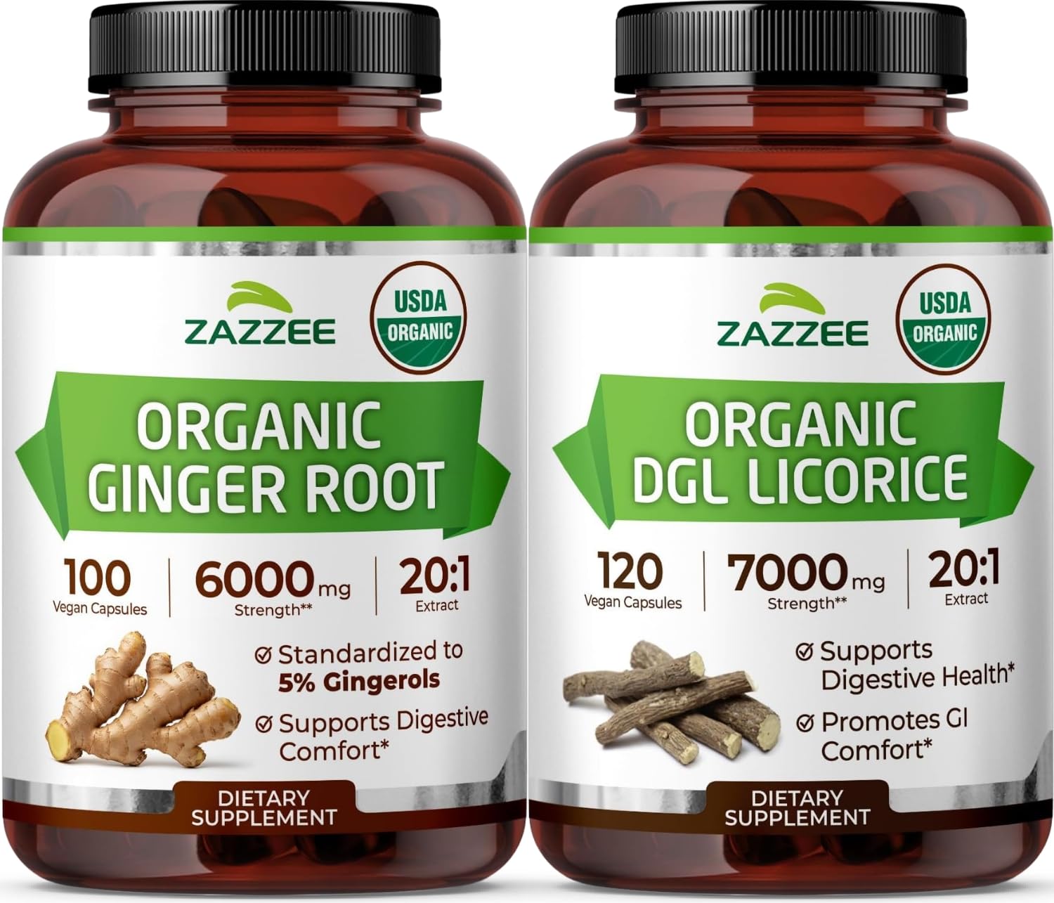 Zazzee USDA Organic Gut Health Support Bundle | 20:1 DGL Licorice Root Plus 20:1 Ginger Root Capsules | Non-GMO Vegan & ISO Lab Tested