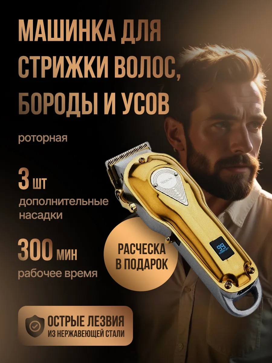 Комплектация3 дополнительные насадки - 6,10,13мм, USB шнур для зарядки, кисточка для очистки лезвий, расческа