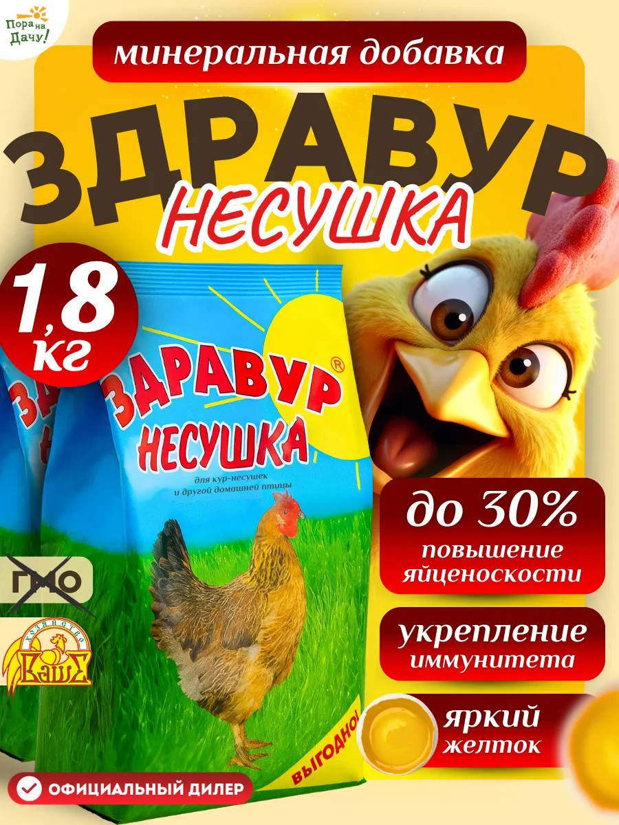 "Zdravur Nesushka" is a premix for laying hens and other poultry containing 11 vitamins (A, D3, E, B2, B3, B4, B5, B6, B12, K, H), 7 microelements, essential amino acids, and enzymes.