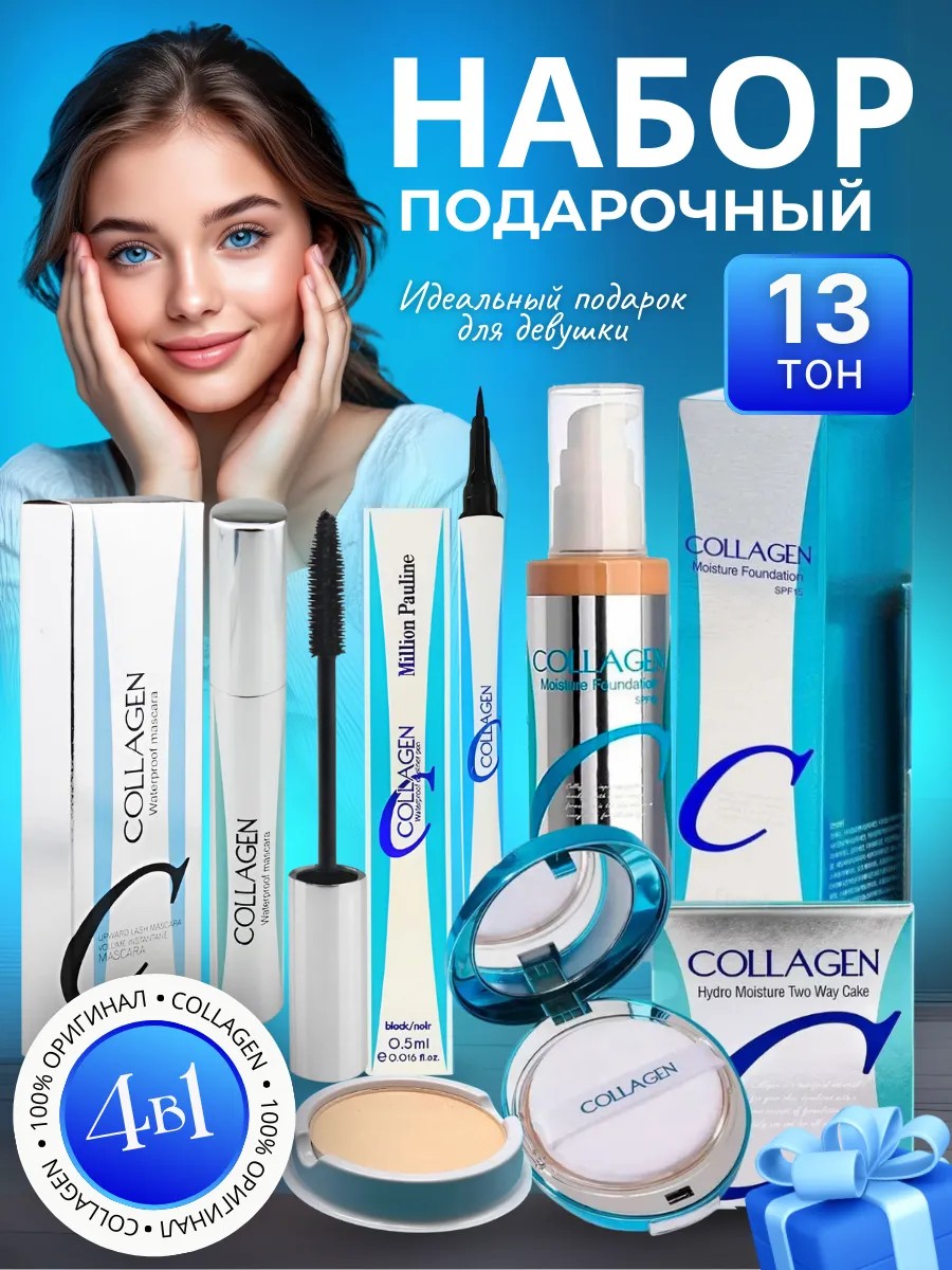 Beauty box/Beauty box/Collagen/Powder/Foundation /For girls with makeup/Mascara/Collagen/Concealer. A great gift. Set contents: Collagen foundation (#13;#21 shades) - evens out tone, masks imperfections and adapts to the natural skin tone; with SPF 15 for the face (sunscreen) has a light coverage, does not dry the skin and creates an even tone and radiance. Collagen refill powder (shade 13) adapts to your skin tone without irritating it, allows you to hide imperfections such as freckles, age spots and uneven skin. The soft touch of the powder makes your skin soft and silky, keeping your makeup for a long time. Collagen refill powder (shade 13); Black Collagen mascara is waterproof, curls, lengthens, and adds volume to lashes. Waterproof COLLAGEN mascara has become an absolute bestseller. This mascara with a silicone brush perfectly lengthens and separates each lash thanks to its innovative brush, which coats each lash without clumping or weighing it down. Black Collagen marker eyeliner - thanks to the convenient marker, you can create perfect arrows with a flick of your wrist. Waterproof Collagen felt-tip eyeliner is for anyone who dreamed of the perfect cat eye but was afraid of failure. These products are suitable for daily use. Gift set collagen/collagen/COLLAGEN/COSMETICS SET/gift set of cosmetics/for a girl/mom/sister/cosmetics box/collagen cosmetics/for the face/for skin/wife/woman/girlfriend/set,sets,set,set,sets,sets,cosmetics,cosmetics,cosmetics/cosmetics/cosmetics/makeup/makeup/cosmetic/cosmetic/cosmetic/cosmetic/women's/women's/women's/women's/women's/gift/gift/gift/gift/box/boxes/box/boxes/women/women/women/woman/care/care/care/care/face/face/creams/girls/girls/skin/skin/skin/mascara/mascara/eyelashes/eyelashes/eyelashes/beauty/box/March 8/