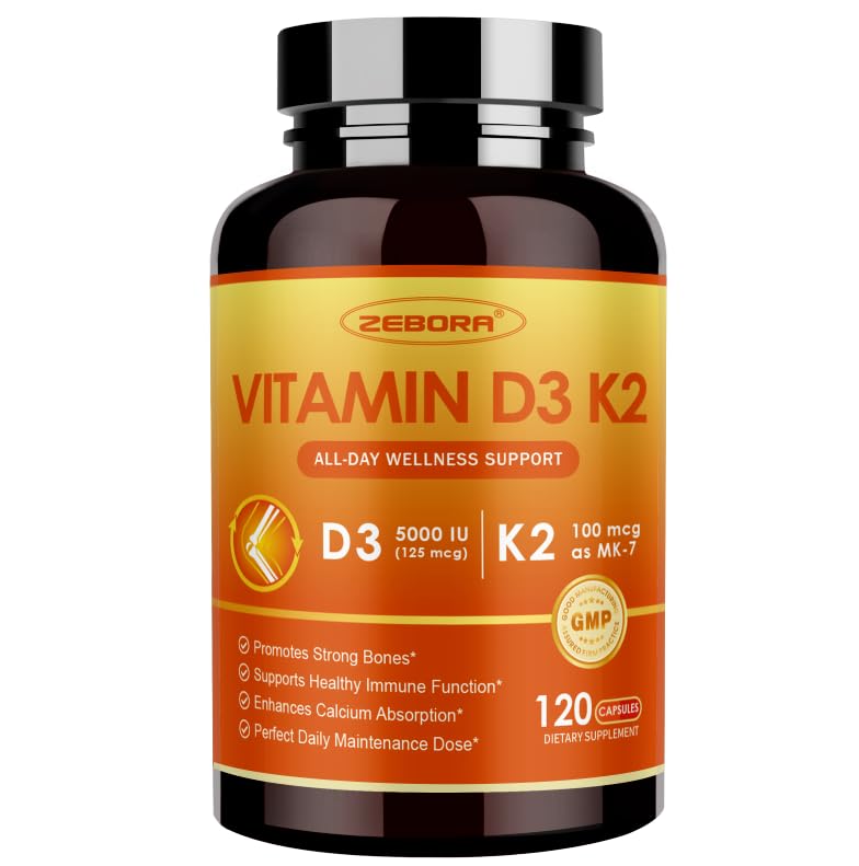 ZEBORA 6-in-1 Upgraded Vitamin D3 K2 Supplement Vitamin D3 5000IU + Vitamin K2 MK7 100mcg for Bone & Immune Support Efficient Absorption Non-GMO 120 Capsules 120 Count (Pack of 1)