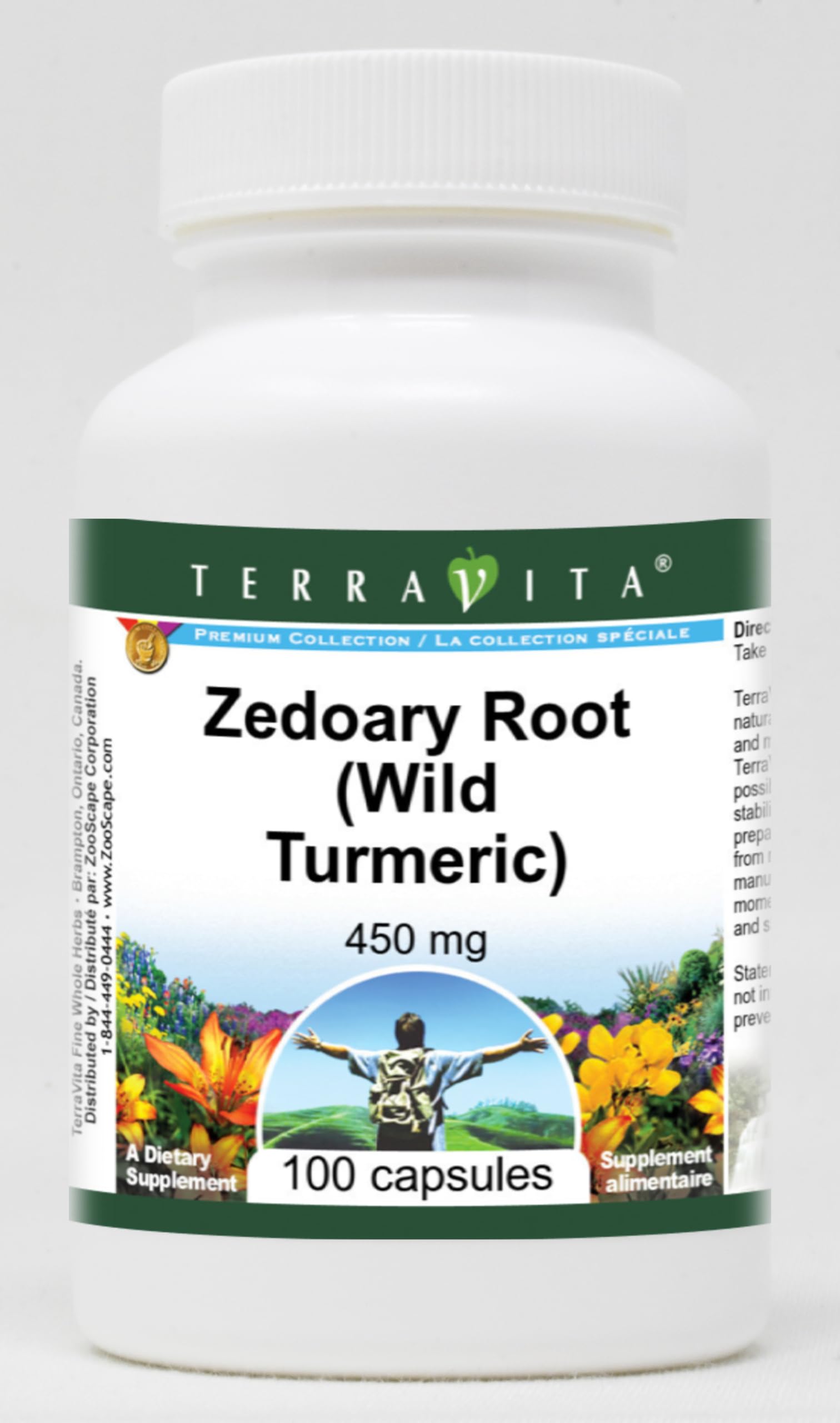 Zedoary Root (Wild Turmeric) - 450 mg (100 capsules, ZIN: 512624) Packaged in the United States in a GMP certified facility (Good Manufacturing Practice). No fillers. Manufacturer: TerraVita Size: 100 capsules Easy-to-swallow Capsules in a sealed bottle. Ingredients: Gelatin, Water, Zedoary - 450 mg