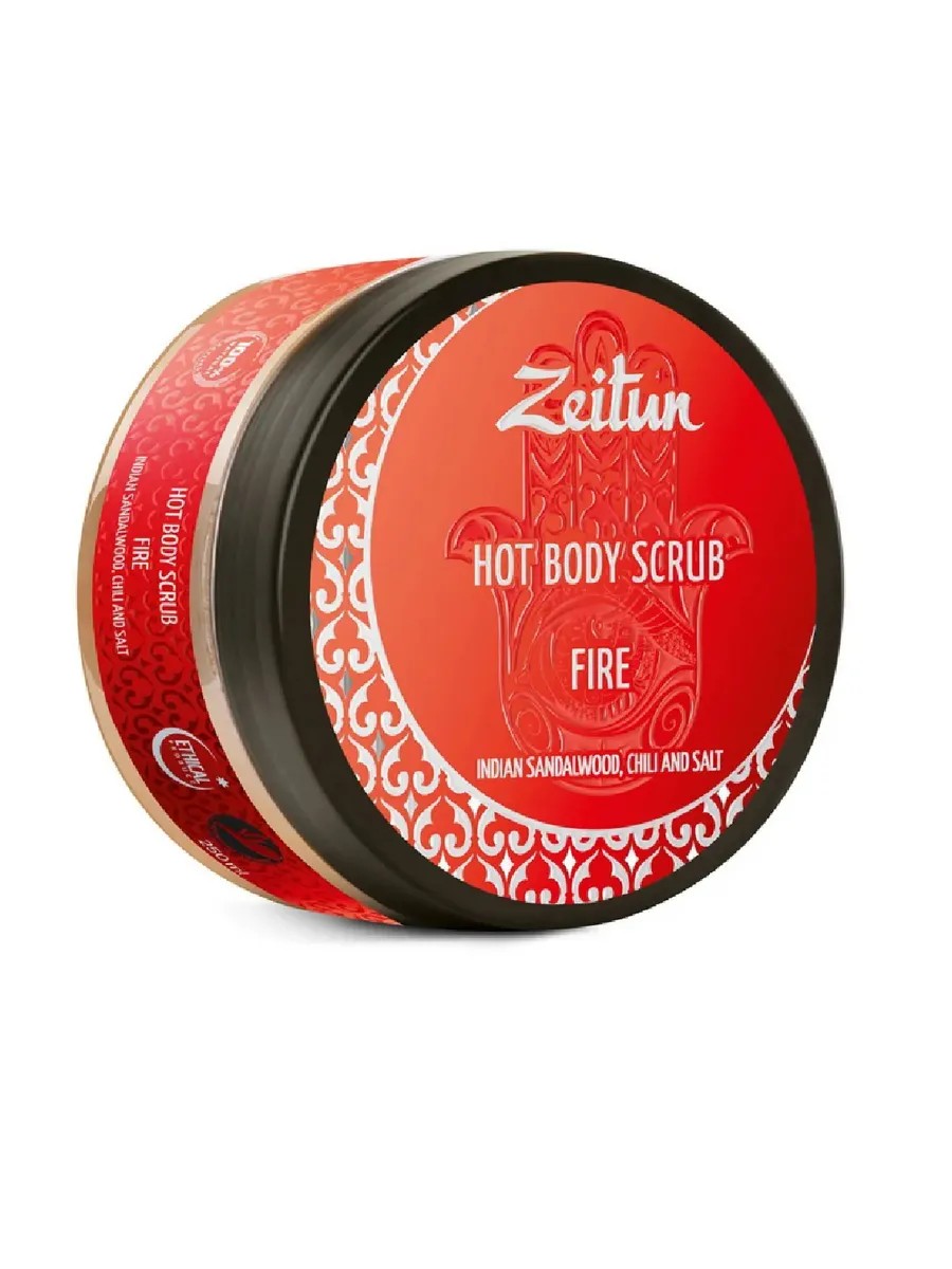 Zeitun. Hot Fire Body Scrub with Indian Sandalwood and Chili, 250ml. The energy of fire can give your body the desired slimness, perfect your silhouette, and awaken your natural passion, grace, and unpredictability! Zeitun's hot foaming Fire Body Scrub with a natural thermal effect and aphrodisiacs is based on the most fiery natural ingredients that boost blood circulation, activate lipolysis, and effectively burn excess body fat. A natural composition of chili pepper extract, guarana, coffee beans and sandalwood essential oil, framed by sea salts rich in microelements, as well as constant caring oils, provides a comprehensive modeling, anti-cellulite and healing effect, while the magnificent texture of the scrub and the awakening aroma of the senses give an unforgettable experience from each procedure.