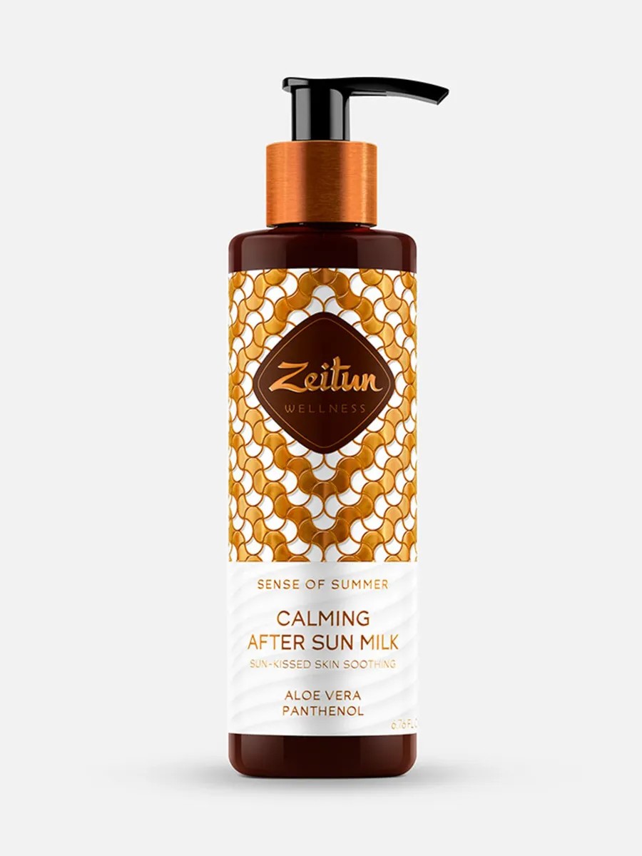 ZEITUN Wellness Sun Ritual After-Sun Milk 200 ml. Pamper your skin with care and comfort after summer sunbathing with this after-sun milk. The natural restorative formula with D-panthenol, Aloe Vera, and Vitamin E not only soothes skin after sun exposure, relieves burning, irritation, and discomfort, and stimulates cell regeneration, but also leaves a refreshing fruity scent with notes of apple, kiwi, and lime. Thanks to valuable avocado oil, this after-sun milk completely replenishes cellular moisture, prevents flaking and dryness, and keeps skin soft and healthy. Ingredients: aqua, caprylic/capric triglyceride, polyglyceryl-3 polyricinoleate, glycerin, sorbitan oleate, beeswax, persea gratissima (avocado) oil, orbignya martiana seed oil, macadamia ternifolia seed oil, simmondsia chinensis (jojoba) seed oil, aloe barbadensis leaf juice, tocopheryl acetate, panthenol, allantoin, menthol, sodium chloride, tocopherol, potassium sorbate, sodium benzoate, benzyl alcohol, ethylhexylglycerin, parfum.