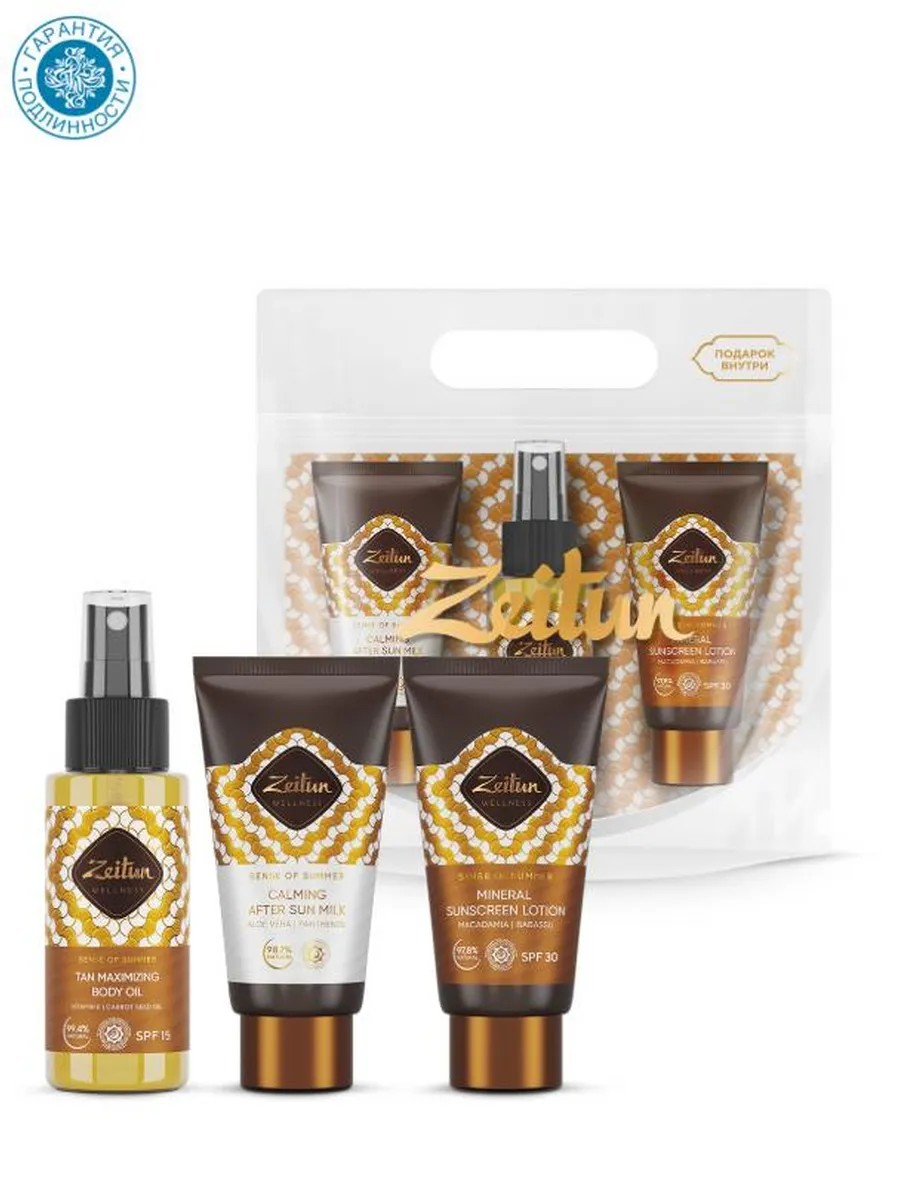 Получите желаемый, красивый и безопасный загар с солнцезащитными средствами Zeitun! Всё необходимое в одном наборе, который не займет много места в багаже."