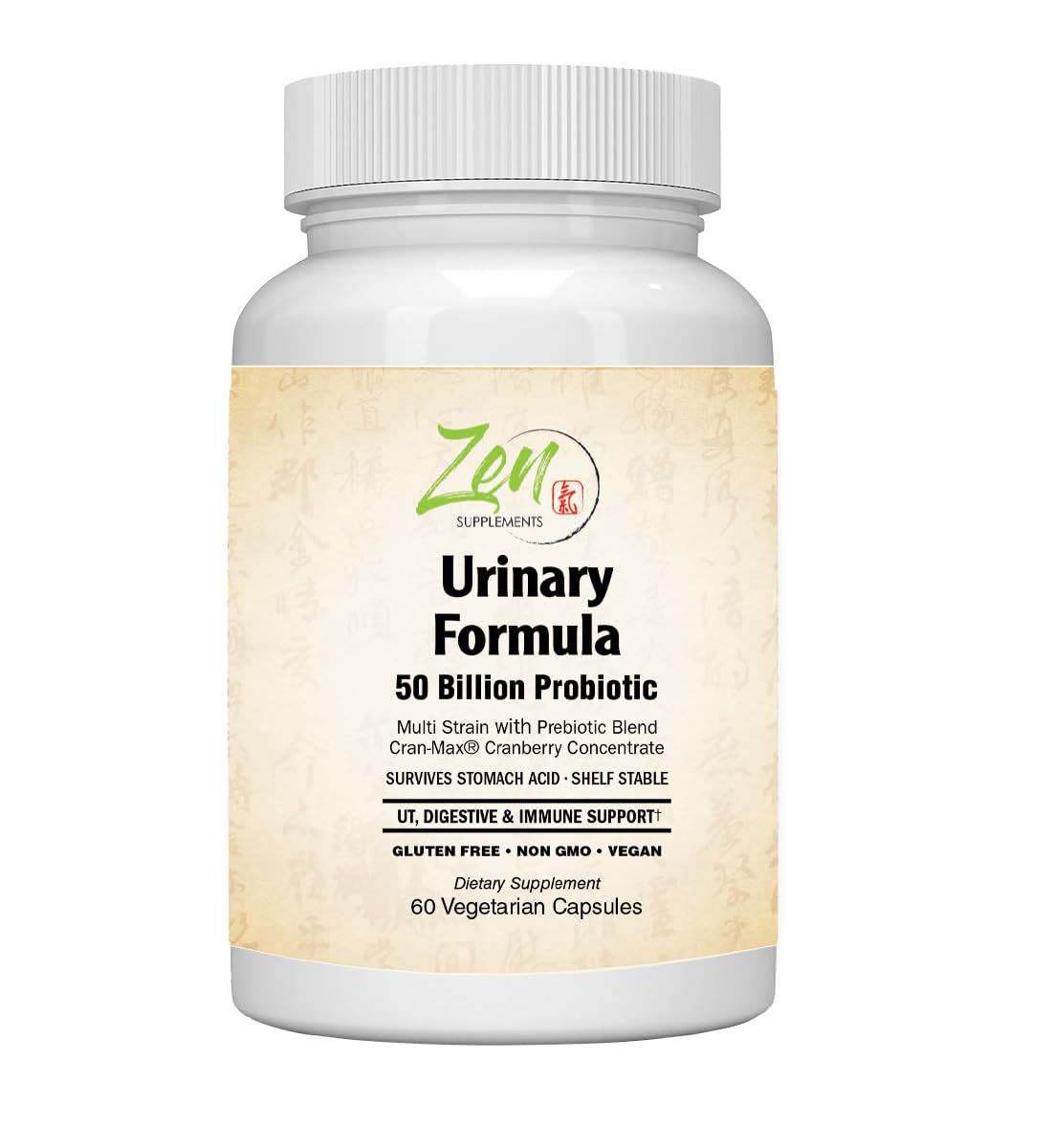 Zen Supplements Urinary Formula Probiotic is a powerful probiotic supplement designed to support urinary tract and immune health. With 50 billion live cultures and a proprietary blend that includes clinically studied Cran-Max Cranberry, this formula is formulated to help maintain a healthy balance of microflora. The organic agave inulin acts as a prebiotic to nourish the beneficial bacteria, while the pure cranberry concentrate is delivered via a patented system that protects it until it reaches the lower gastrointestinal tract for maximum effectiveness. This supplement is 100 pure and natural, making it a safe and effective choice for promoting urinary and immune wellness. The convenient capsule form makes it easy to incorporate into your daily routine. Support your body's natural defenses with Zen Supplements Urinary Formula Probiotic.Vegan, Non-GMO Allergen-Free Formula – Our high-potency probiotic supplement is crafted with Bio-Enhanced Acid Resistant Strains (BEARS) for superior survivability, ensuring that probiotics reach your gut alive and effective without the need for enteric coating. Made without gluten, dairy, soy, or GMOs, this third-party tested formula is 100 vegan and free from artificial fillers or additives. Experience a clean, science-backed supplement that prioritizes purity, potency, and your overall well-being. Immune-Boosting Vitamin D3 – Each serving contains 1000 IU (25 mcg) of organic, vegan Vitamin D3 sourced from whole food algae to support immune function, bone health, and overall wellness. Vitamin D3 plays a crucial role in strengthening the immune response, reducing inflammation, and maintaining strong bones and muscles. This plant-based, bioavailable form ensures optimal absorption, making it a superior alternative to synthetic D3. Get comprehensive urinary, digestive, and immune support in one powerful formula. Prebiotic Fiber Blend for Gut Health – Packed with a 600mg Prebiotic Fiber Blend, including organic pea starch, acacia, and agave inulin, this formula nourishes beneficial probiotics and promotes a balanced gut microbiome. Prebiotics serve as food for probiotics, ensuring they thrive and multiply, helping to support digestion, regulate bowel movements, and improve nutrient absorption. A healthy gut is essential for immune defense, metabolism, and overall well-being, making prebiotics a must-have for optimal health. Clinically Proven Cranberry Extract – Formulated with 500mg Cran-Max Cranberry concentrate, using Bio-Shield Technology for superior absorption and long-lasting urinary tract benefits. Cran-Max is clinically proven to support bladder health, flush out harmful bacteria, and help prevent recurrent UTIs. Unlike regular cranberry powder, this extract delivers potent proanthocyanidins (PACs) to the lower GI tract for optimal urinary tract protection and antioxidant support. Advanced Urinary Digestive Support – Our Urinary Formula 50 Billion Probiotic is designed to promote urinary tract health, gut balance, and immune support with a powerful blend of 50 billion CFUs from clinically studied probiotic strains, including L. reuteri L. acidophilus. These strains are known for their ability to support a healthy vaginal and urinary microbiome, combat harmful bacteria, and enhance overall digestive wellness, making it an ideal choice for both men and women.