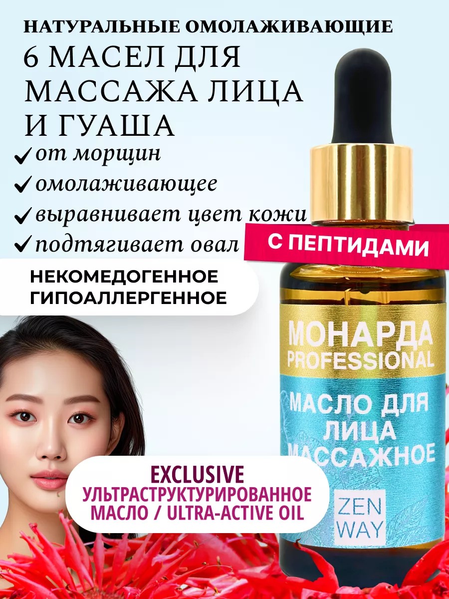 Массажное масло для лица от ZENWAY – это идеальное средство, которое сделает вашу кожу невероятно красивой и гладкой. Натуральный состав, гипоаллергенные свойства, универсальность в применении, содержание полезных натуральных компонентов и комплексный эффект сделали косметику прекрасным решением для каждой женщины! Профессиональное базовое косметическое средство прекрасно подойдёт для всех типов кожи. Может применяться для нормальной и комбинированной, жирной и сухой, проблемной, а также чувствительной. Подойдёт для ситуаций, когда постоянно появляются покраснения и красные точки, от которых хочется избавиться как можно скорее. Отличается комплексным подходом и моментальным эффектом, благодаря особому составу и уникальным свойствам. Поможет убрать серый тон, устранить морщины, отечность, дряблость и поплывший овал подбородка, а также применяется для уменьшения воспалений и выравнивания тона. Устраняет мимические морщинки вокруг глаз. Может применяться как антивозрастное решение для омоложения, когда хочется вернуть гладкую, чистую и совершенную кожу, делая вас более привлекательной. Восстанавливает и возвращает здоровый сияющий цвет. Витамины A и B, C и E, а также F стимулируют естественную выработку коллагена и выводят токсины. База отлично разглаживает глубокие морщины и неприятные возрастные линии. Делает лицевой массаж более эффективным, что позволяет укрепить мышечный каркас. 100% природный натуральный состав – безупречный вариант для ежедневного использования. Наше масло для лица помогает подтянуть кожу лица делая ее более упругой и эластичной. Действие основано на уникальных свойствах цветка монарды и пептидов для лица. Ускоряет кровообращение, обеспечивая защиту от неблагоприятных факторов и внешних условий – ветра, сильного яркого солнца, повышенной сухости воздуха. Отлично борется с пигментацией. Витамины А и Е вместе увеличивают упругость и эластичность эпидермиса. Уменьшают круги и синяки под глазами, выравнивают общий тон, убирают несовершенства.