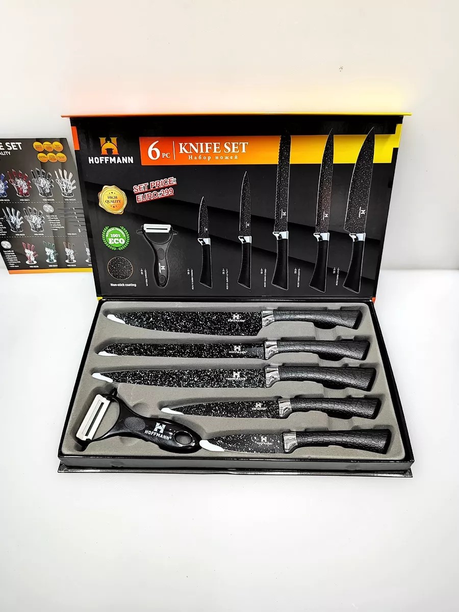 Consists of 6 pieces. The blade is made of stainless steel with an antibacterial coating. Bakelite handle. The set includes: a 20-piece chef's knife for shredding, a 20-piece bread knife, a 20-piece utility knife, a 12.5-piece vegetable peeler, and a 9-piece vegetable peeler with a ceramic blade. For home and professional use. Box size: 36 x 24.5 x 3.5 cm. Blade color: black. Handle color: black. Complete set: chef's knife, shredding knife, bread knife, utility knife, vegetable peeler, and a vegetable peeler with a ceramic blade. Suitable for organizing a holiday, and also as a GIFT. The box with a magnetic lock gives it a gift look.
