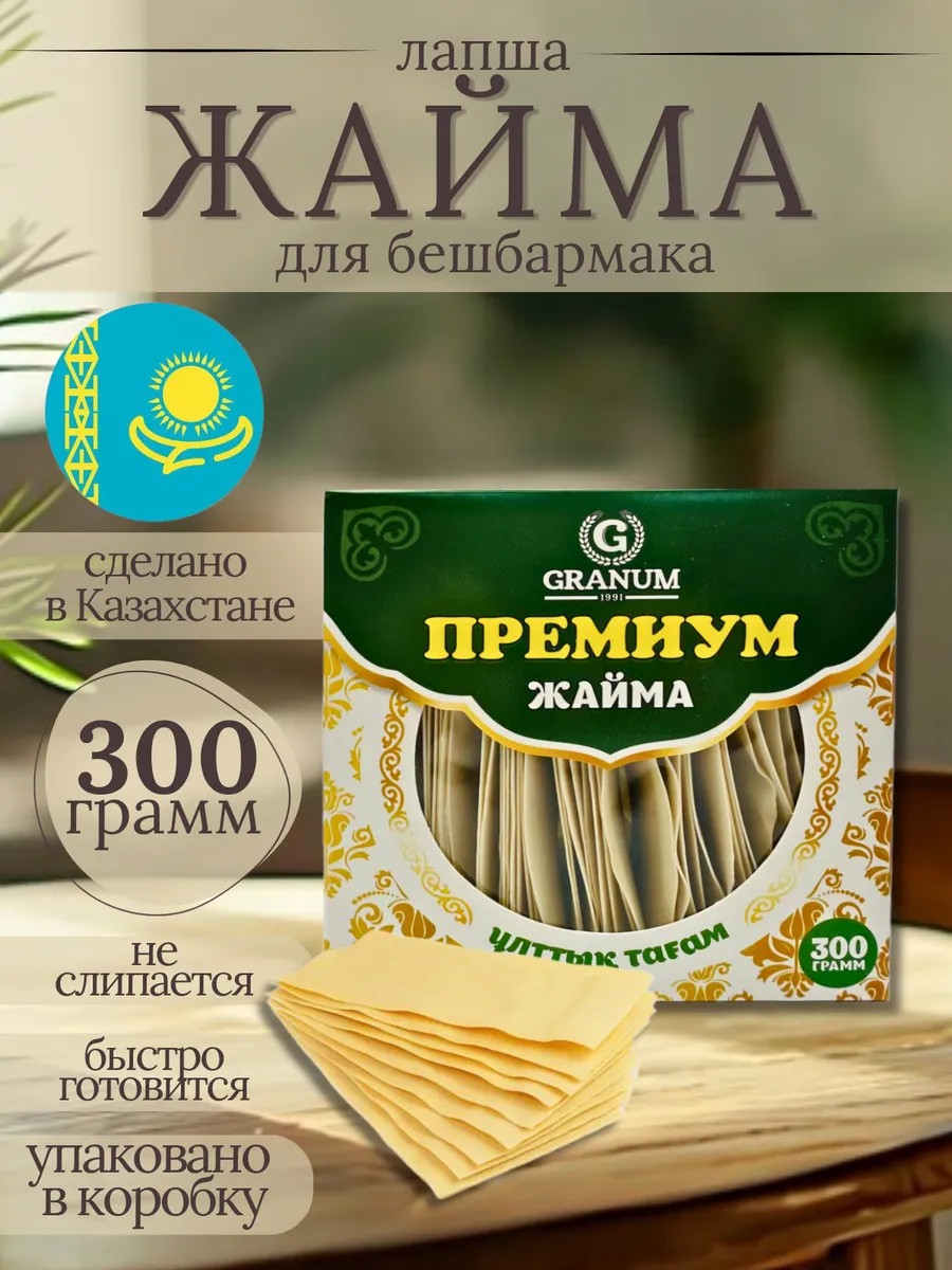 Лапша Жайма — это макаронный продукт, созданный специально для приготовления традиционного казахстанского блюда бешбармак. Изготовленная по домашним рецептам, она отлично передает вкус и текстуру настоящей национальной кухни. Такой продукт позволяет быстро и просто приготовить сытное блюдо, сохраняя аутентичность и насыщенность вкуса.