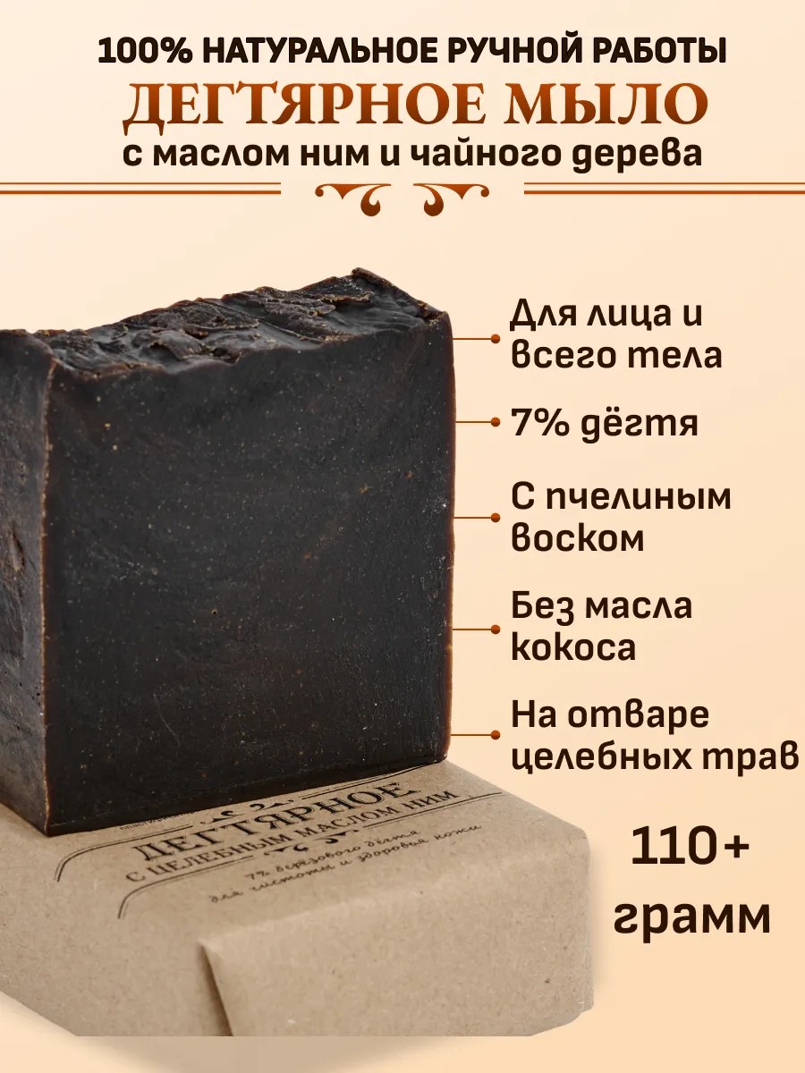 Изготовленное вручую с нуля, это мыло с лечебным и заживляющим свойствами, имеет в основе березовый деготь с добавлением уникального масла ним. Два природных антисептика усиливают друг друга и наполняют полезными свойствами.